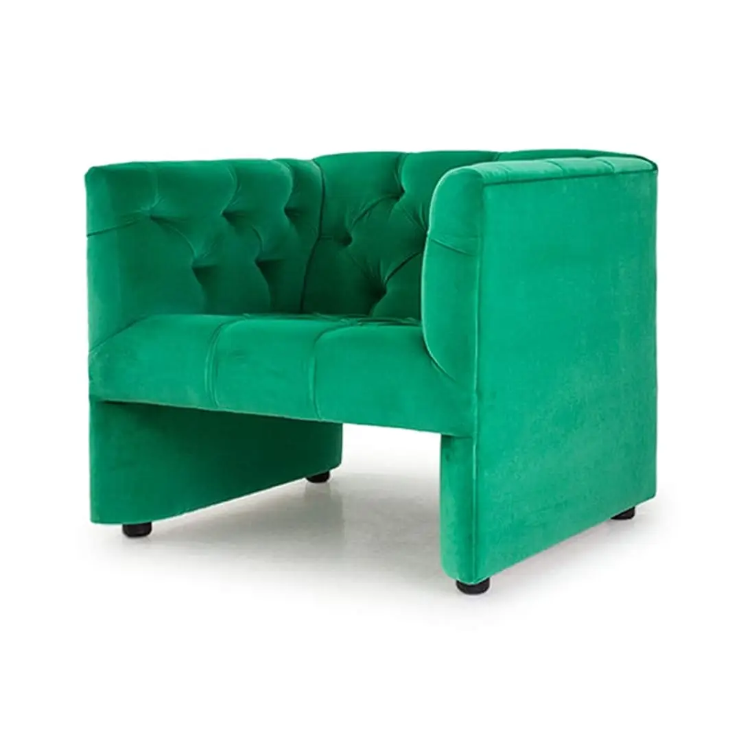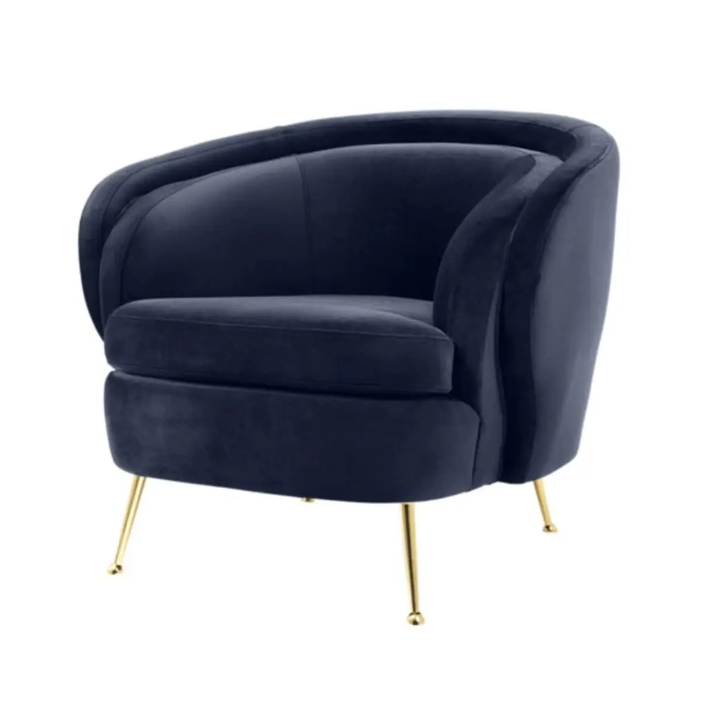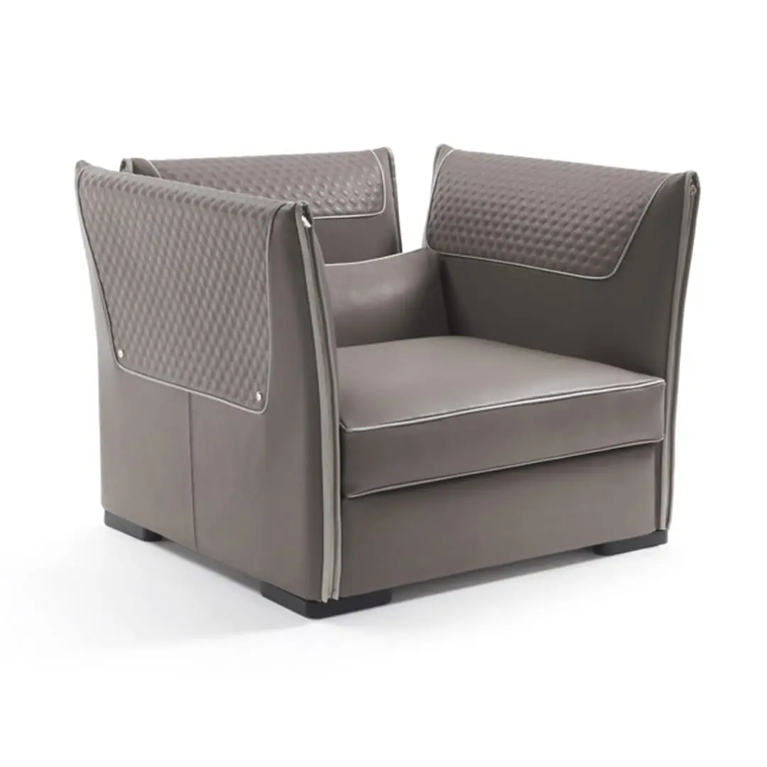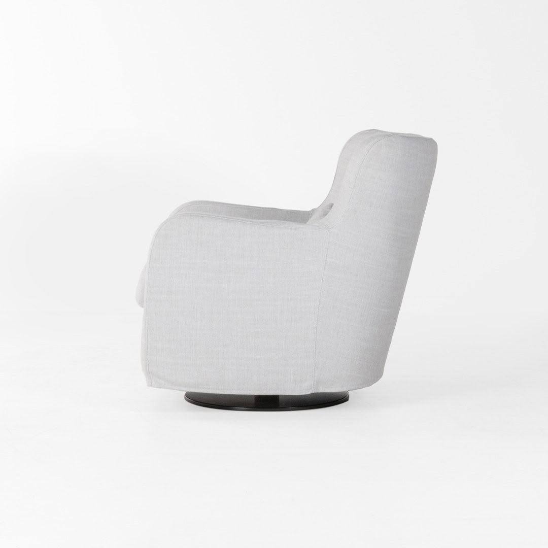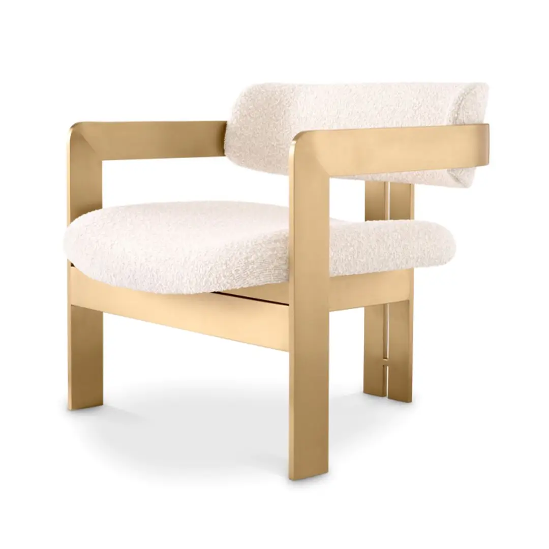 Tan swivel chair with embroidered cushionElegant living room with plush sofas and marble table