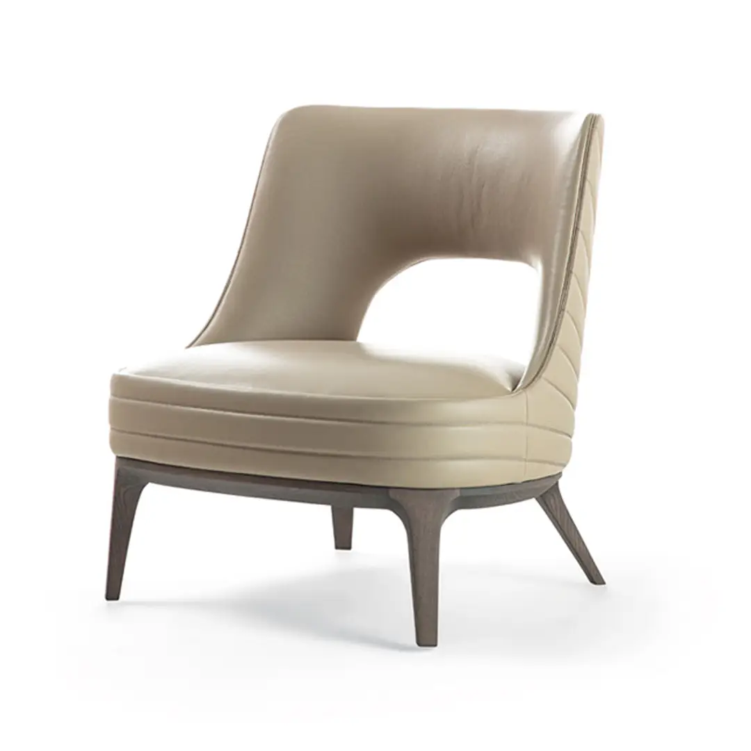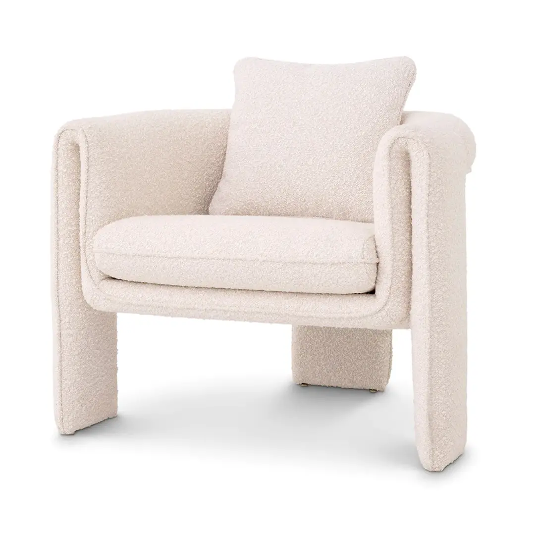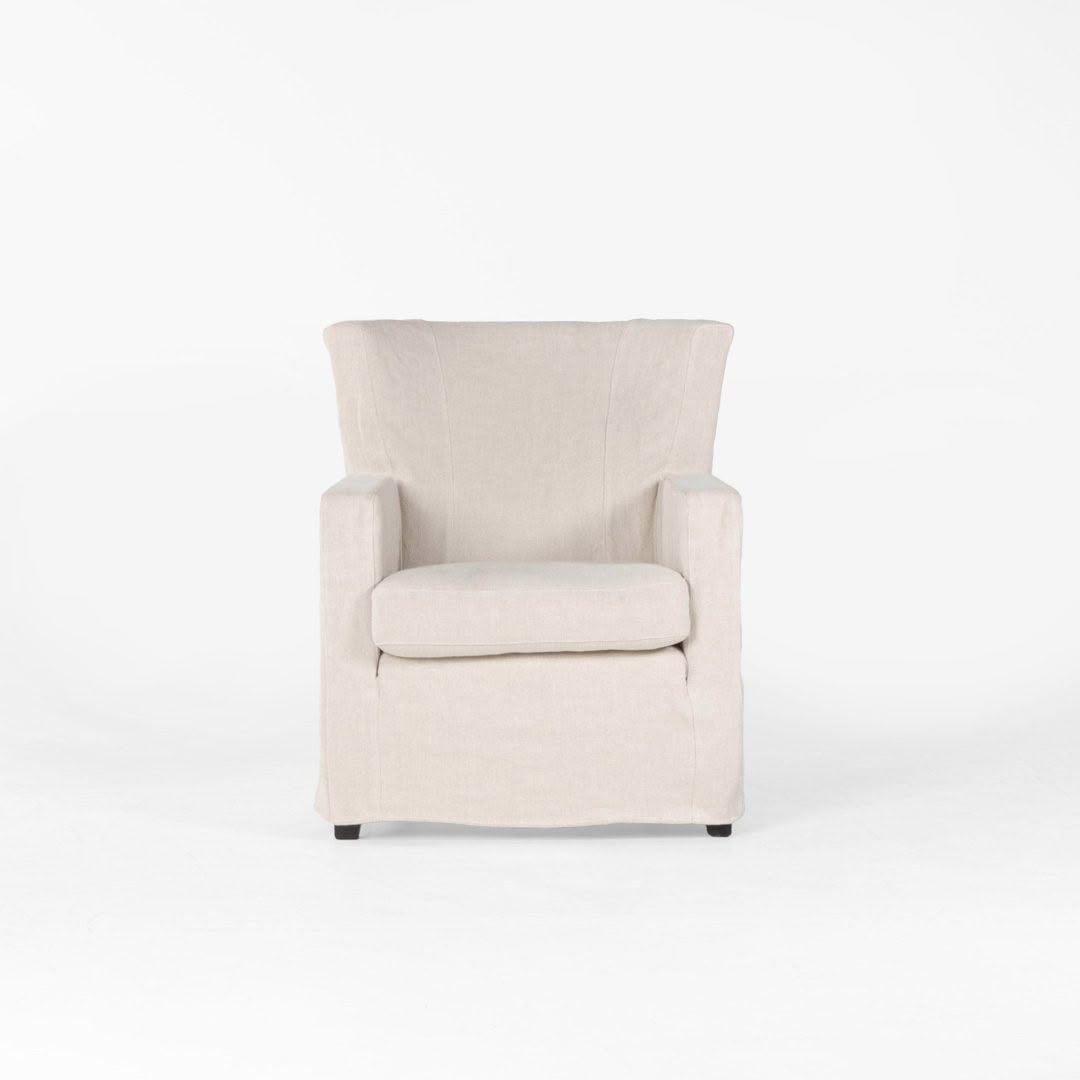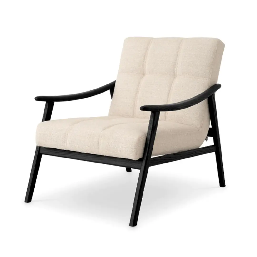 Elegant beige upholstered chair with dark wooden legsElegant cream upholstered chair with dark wooden legs