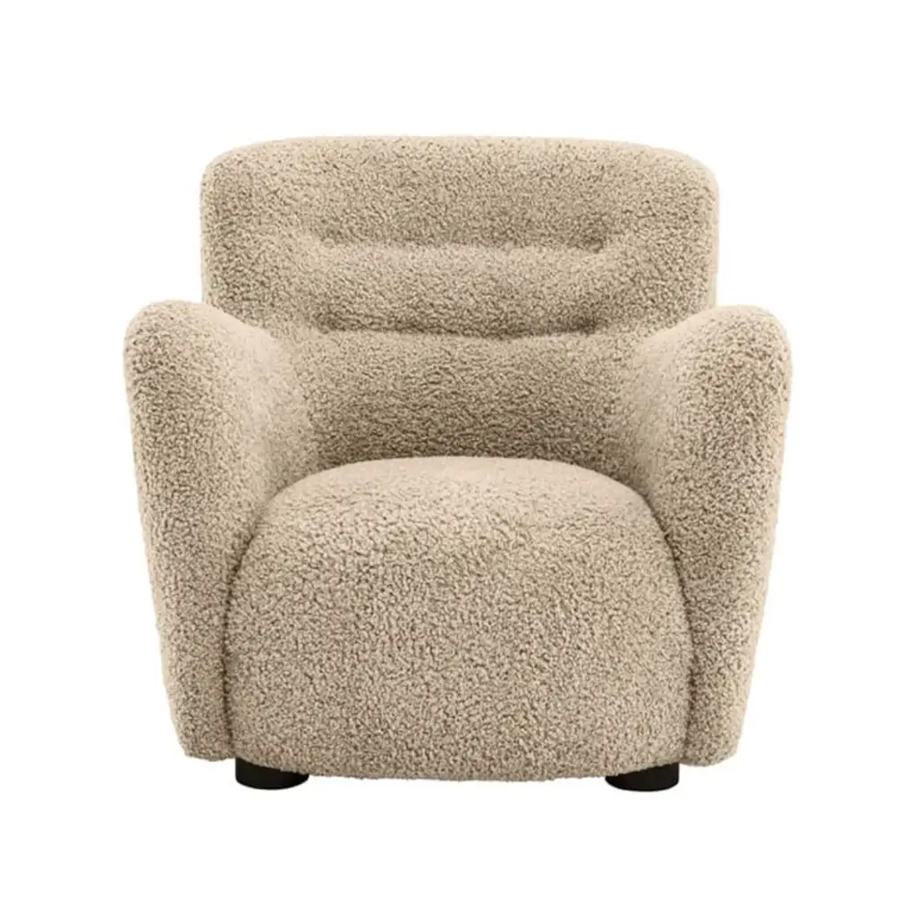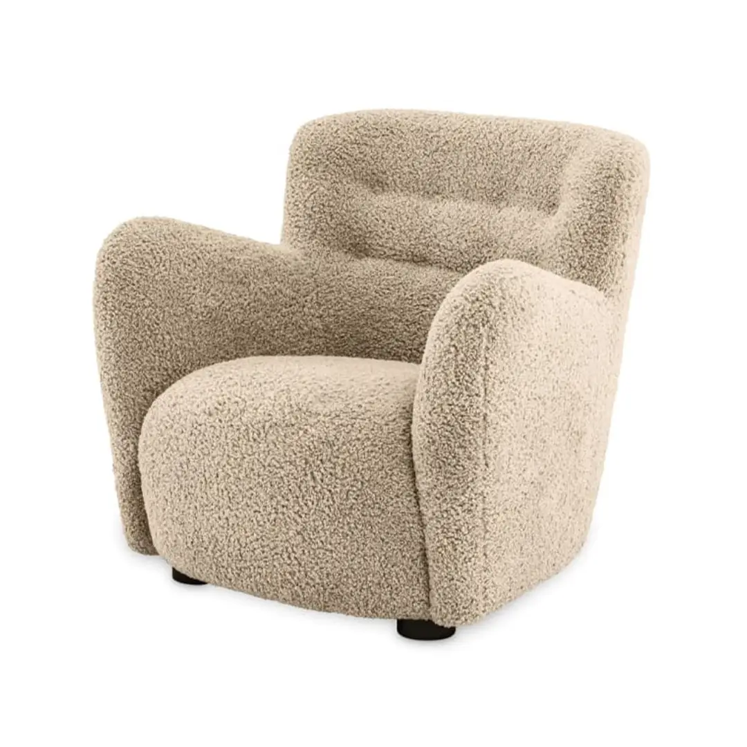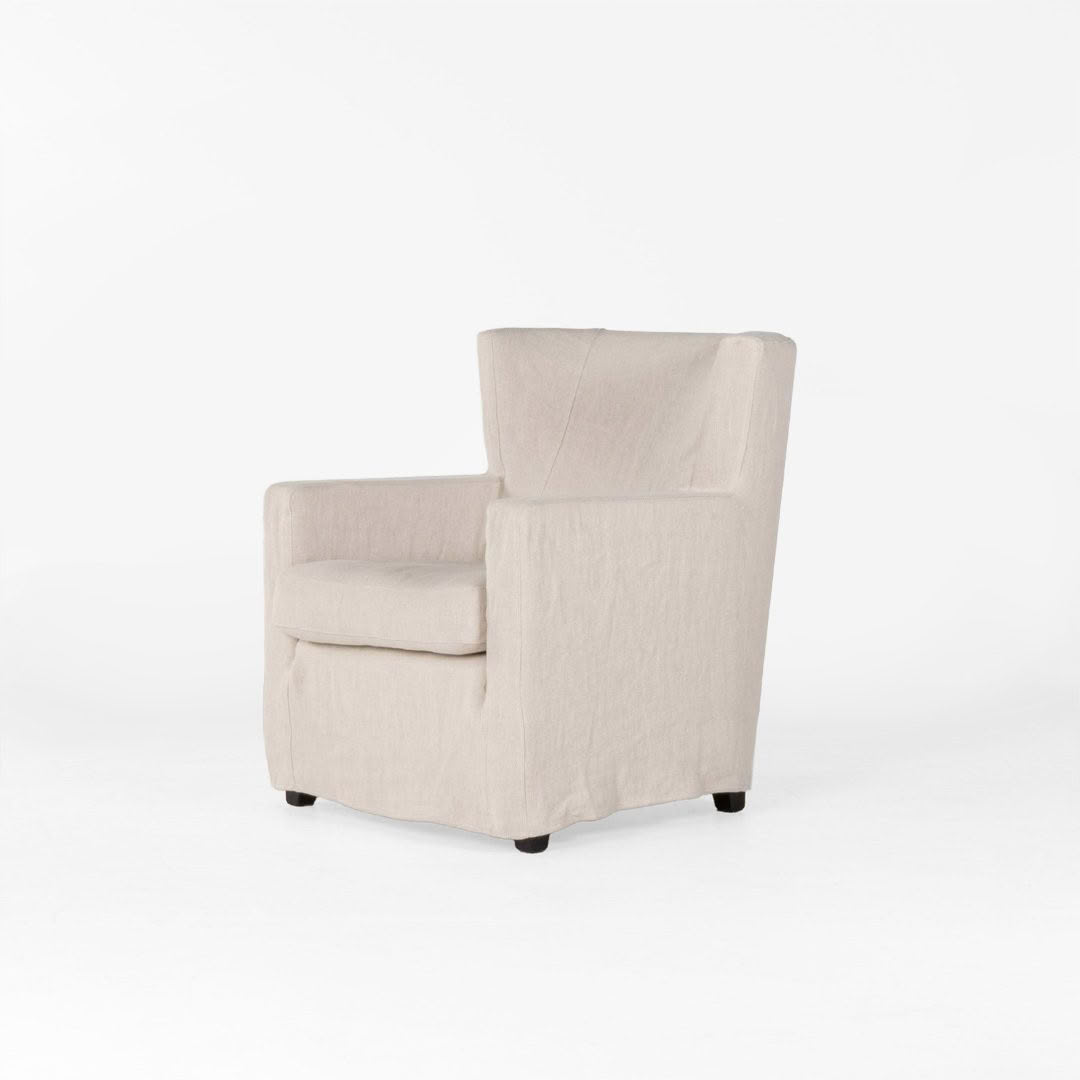 Elegant beige upholstered chair with dark wooden legsElegant cream upholstered chair with dark wooden legs