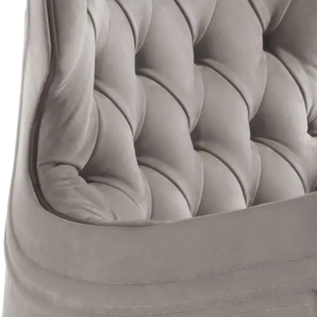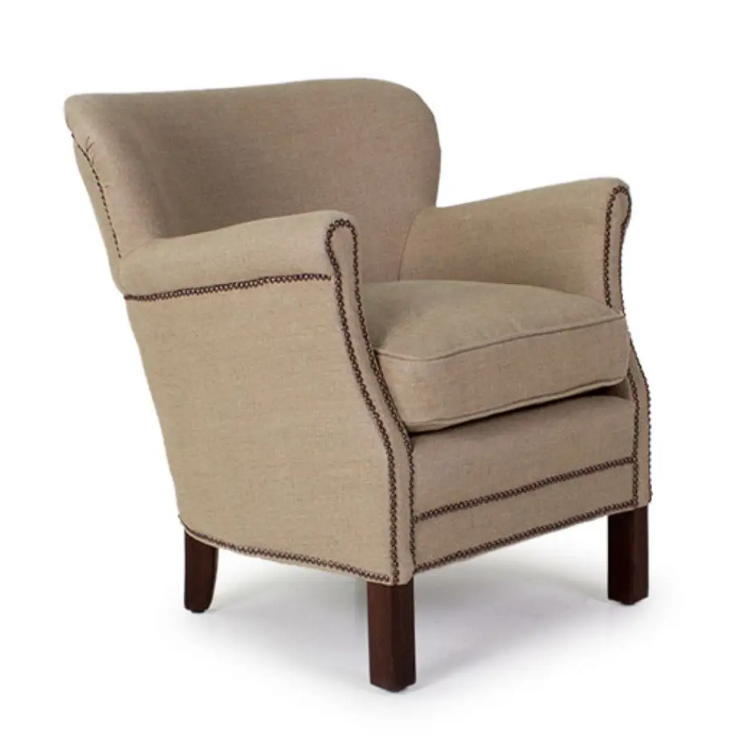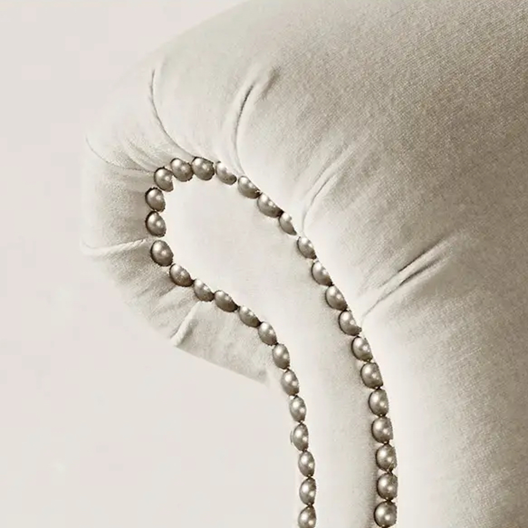 Beige upholstered armchair with nailhead trimClose-up of beige fabric sofa with nailhead trim