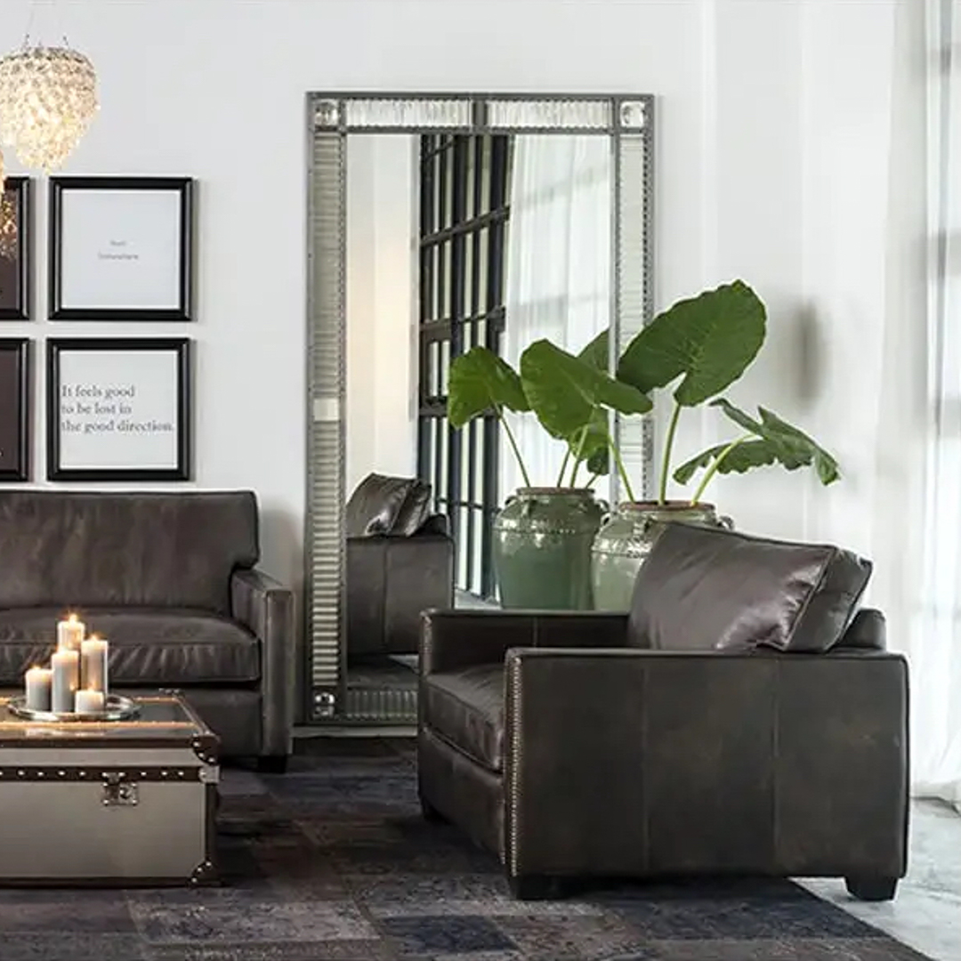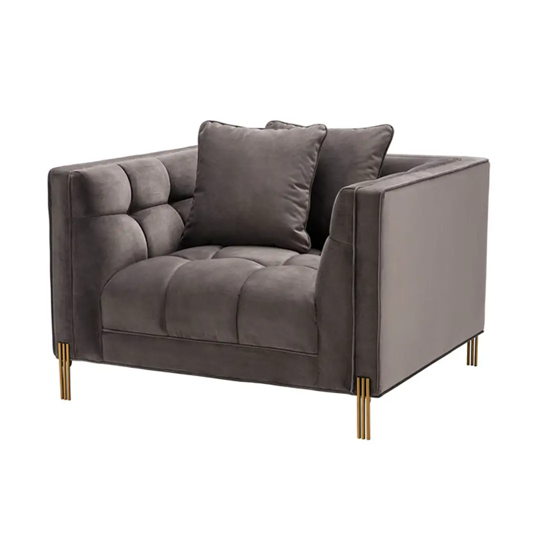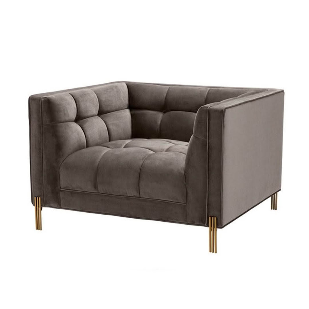 Beige upholstered armchair with nailhead trimClose-up of beige fabric sofa with nailhead trim