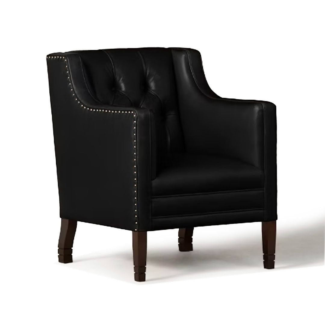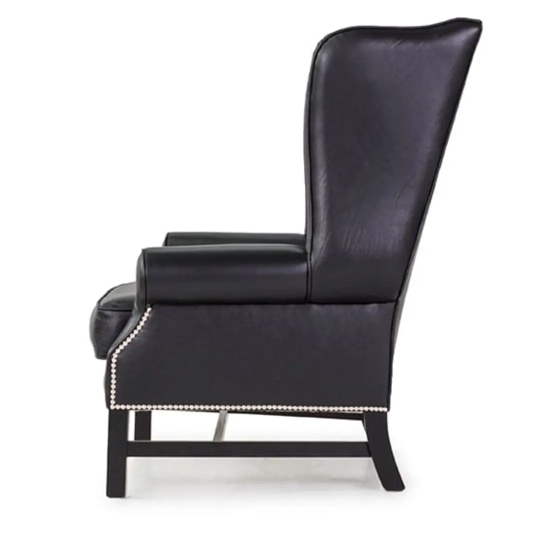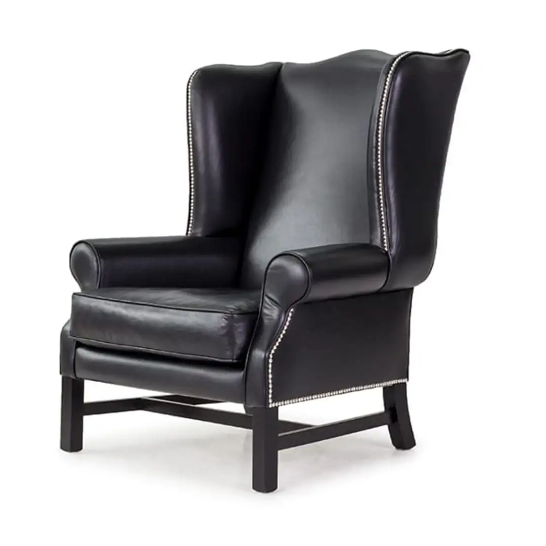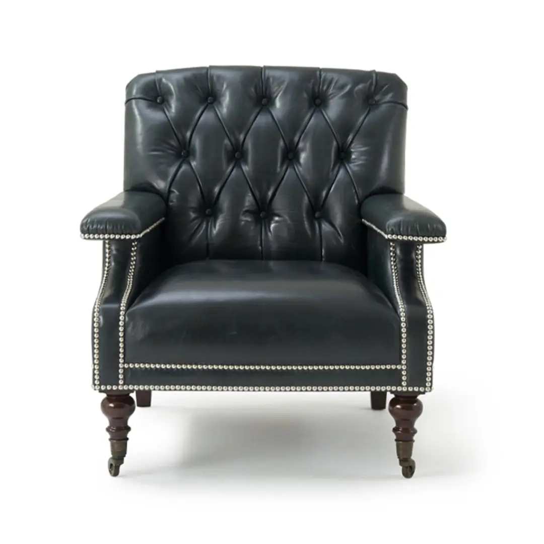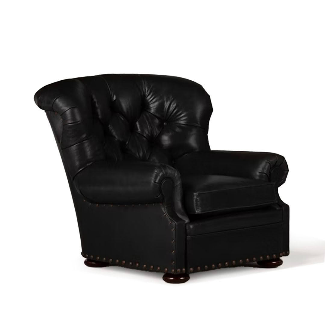 Black leather armchair with brass nailhead trimElegant black leather armchair with brass nailhead trim