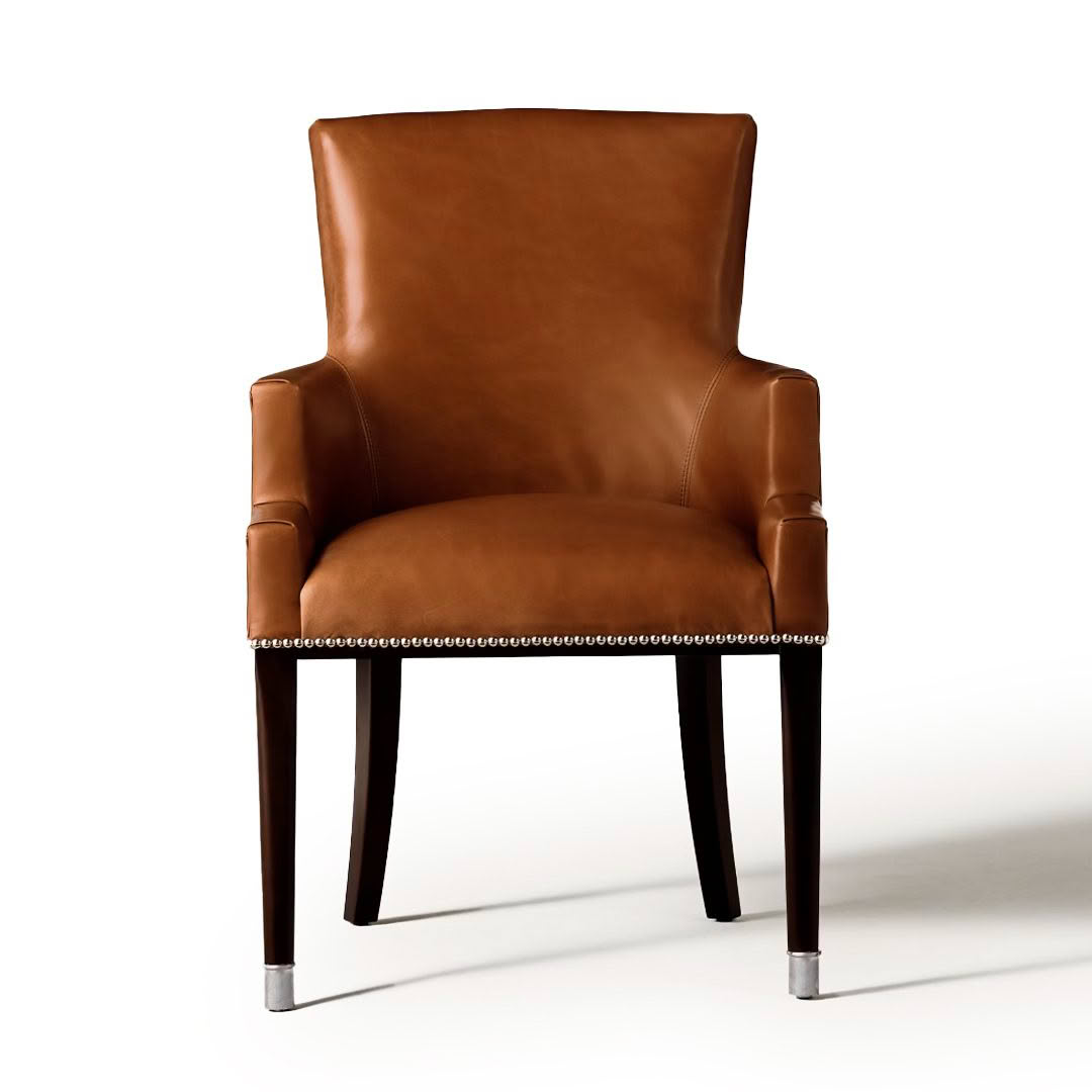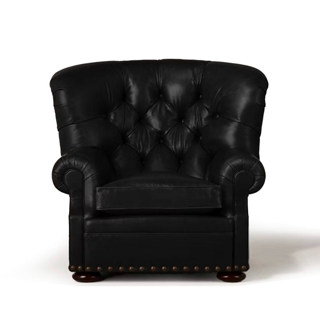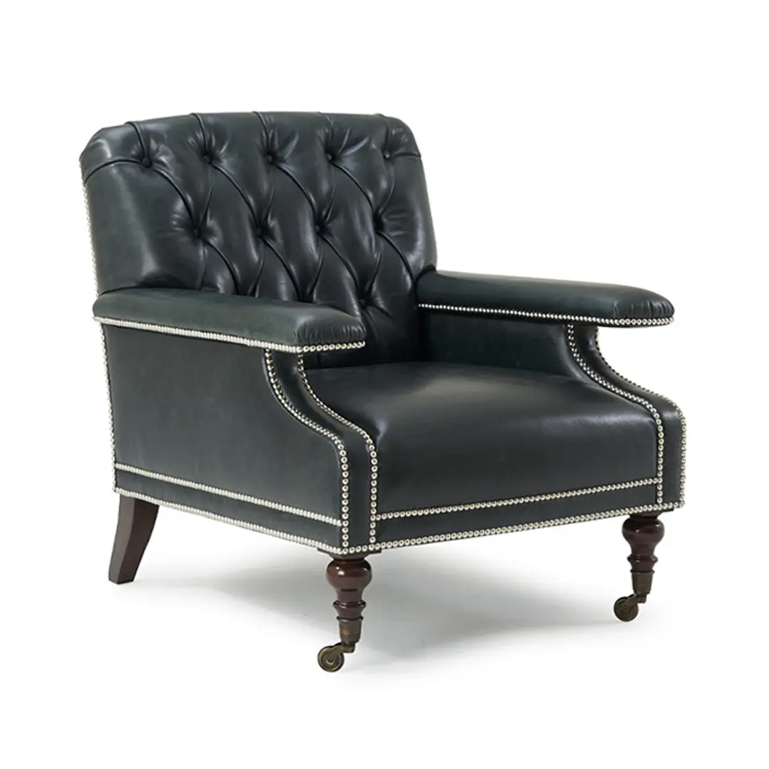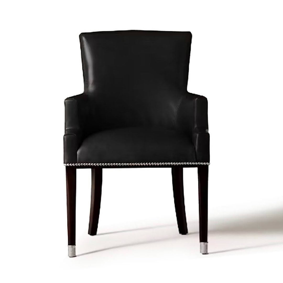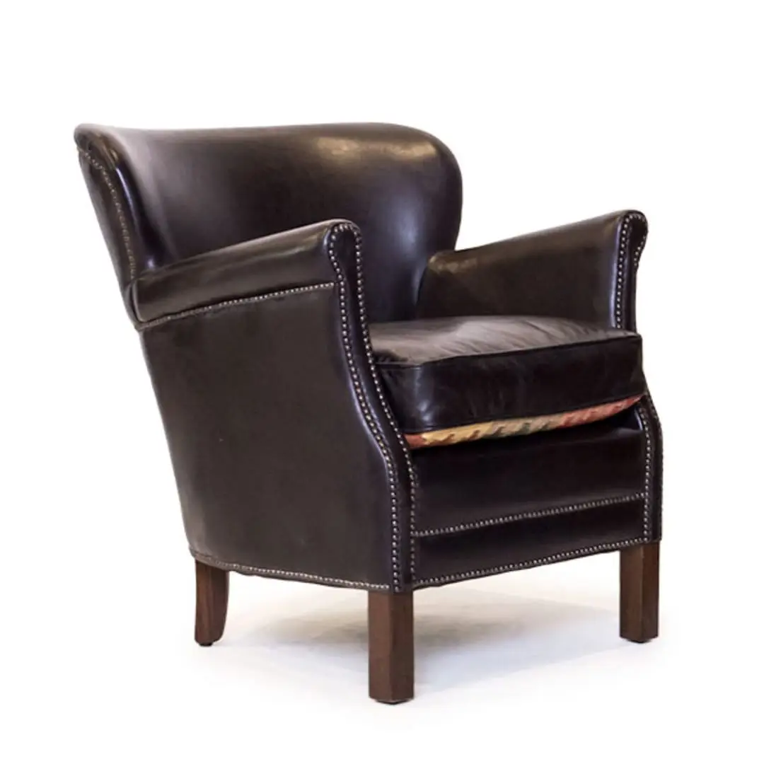 Black leather armchair with brass nailhead trimElegant black leather armchair with brass nailhead trim