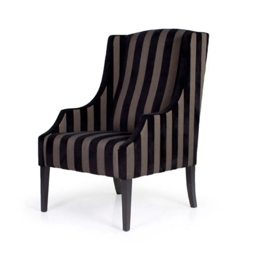 Elegant striped armchair with brown accent pillowElegant black striped armchair with beige cushion