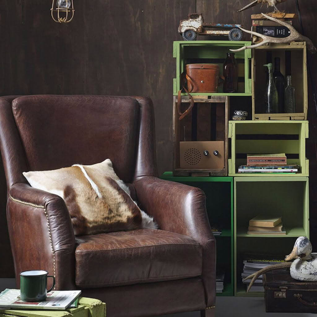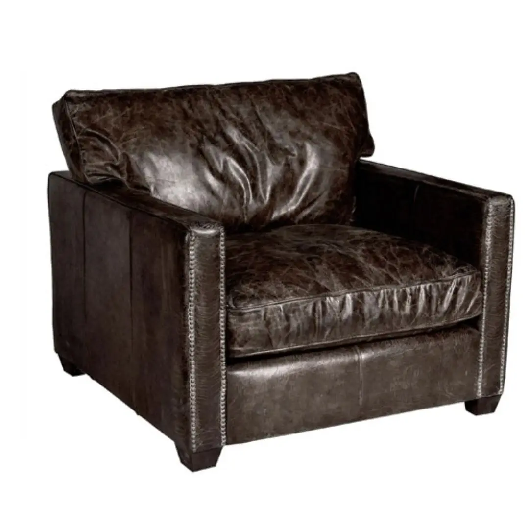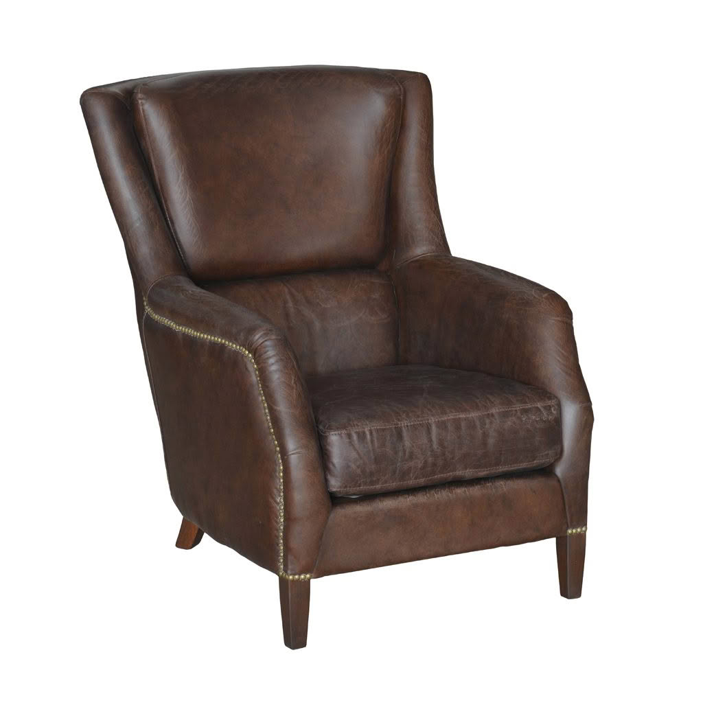Distressed leather high-back chair with nailhead trimVintage leather chair with nailhead trim