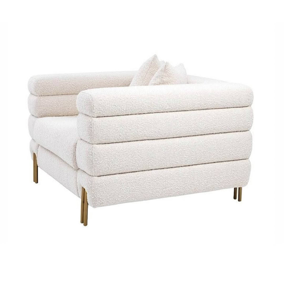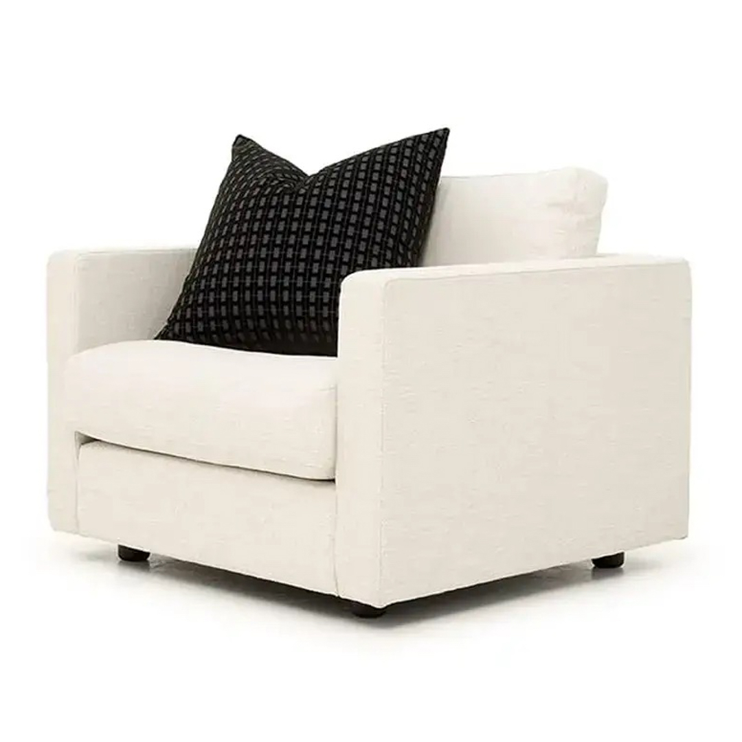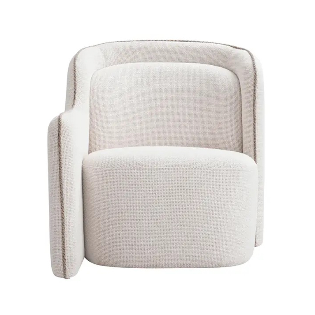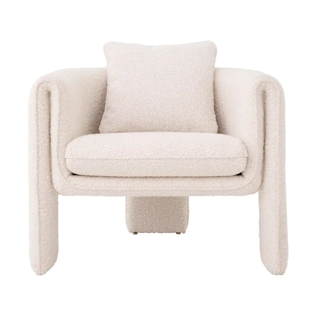 Beige modern armchair with decorative pillowRound beige armchair with pillow, isolated on white