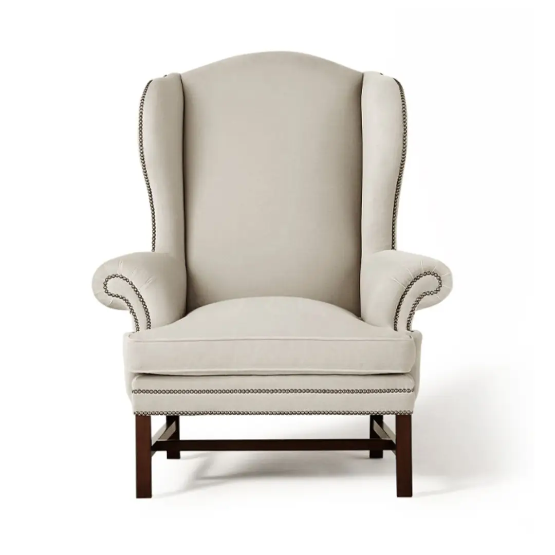 Elegant high-back beige wing chair with dark wooden legsElegant white wingback chair with dark wooden legs