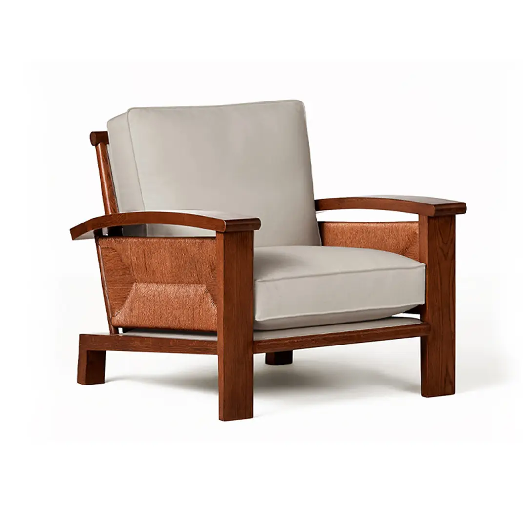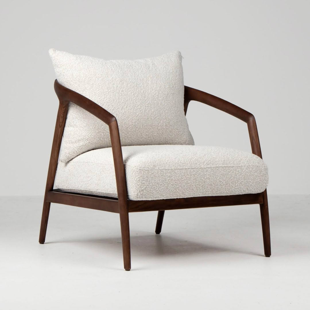 Modern beige armchair with wooden frame on white backgroundModern beige armchair with dark wooden frame
