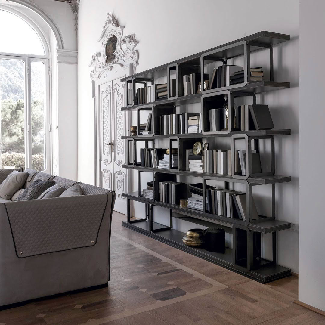 The Griffi bookcase is luxury in details and current in its modular logic. The shelves are covered in leather or hide with stitching in contrast enhancing the tailoring care of the collection. The linearity of the composition is broken by the capable use of the modules, either open or close, available in metal in the finishes of the Vittoria Frigerio Collection, which allow a total expressive freedom. With a contemporary and luxury taste it furnishes every environment, from a metropolitan loft to a luxury residence in historical medieval village.