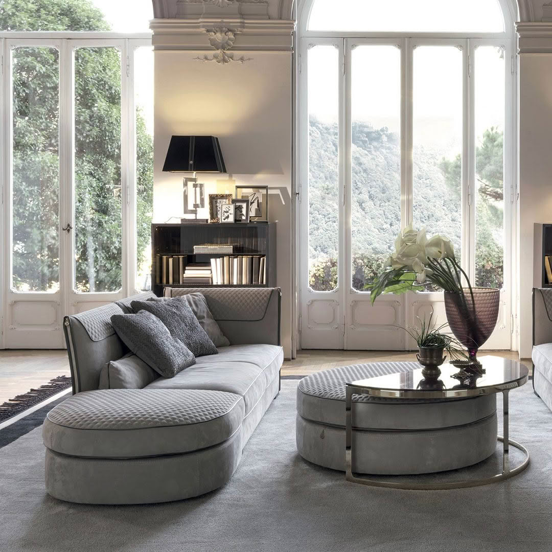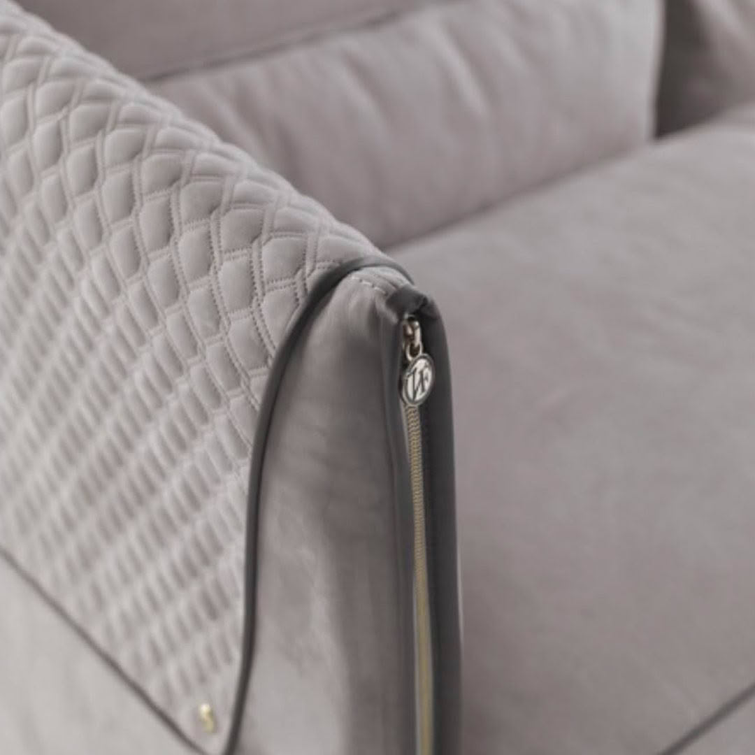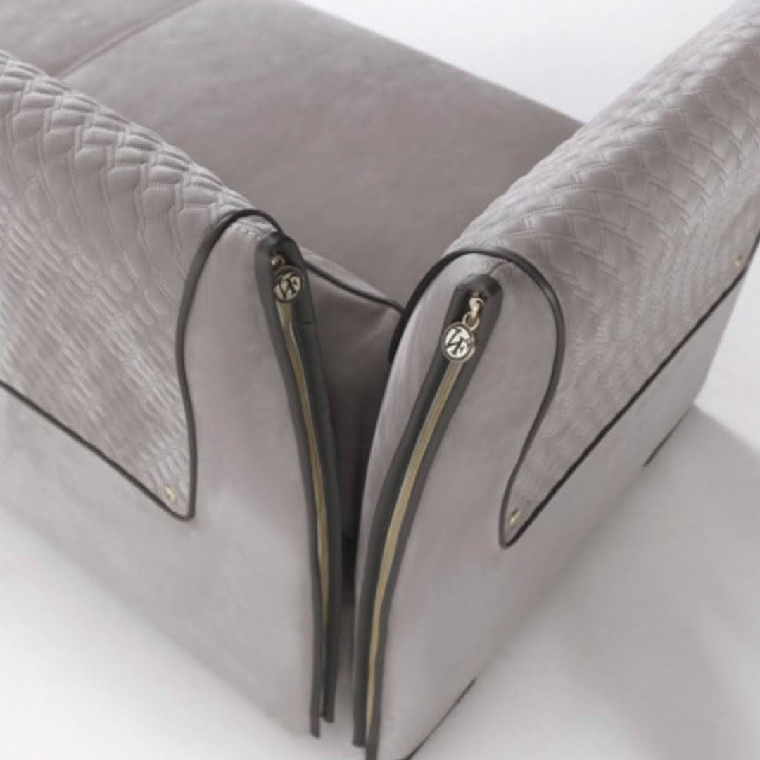 Clivio modular sofa has a design that is both bold and ethereal, thanks to the aerial structure without continuity between armrest and backrest. It is a precious object, to be read on more layers, seeking behind every detail perfection and the desire to excel. Dedicated quilting covers the upper part of the armrests and backrests secured by golden buttons, while integrated lumbar cushions provide additional comfort. The search for the perfect detail culminates in the golden zip, which outlines the profile of the armrest and backrest; the piping, on the other hand, highlights the silhouette and proves Vittoria Frigerio’s care for detail. Clivio is a harmonious fusion of elements that establish a new stylistic rigour.