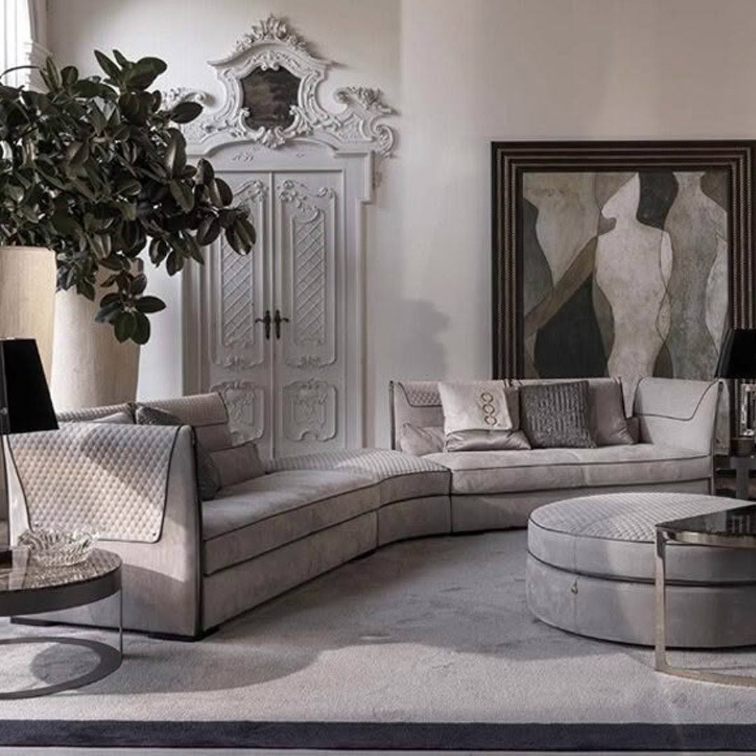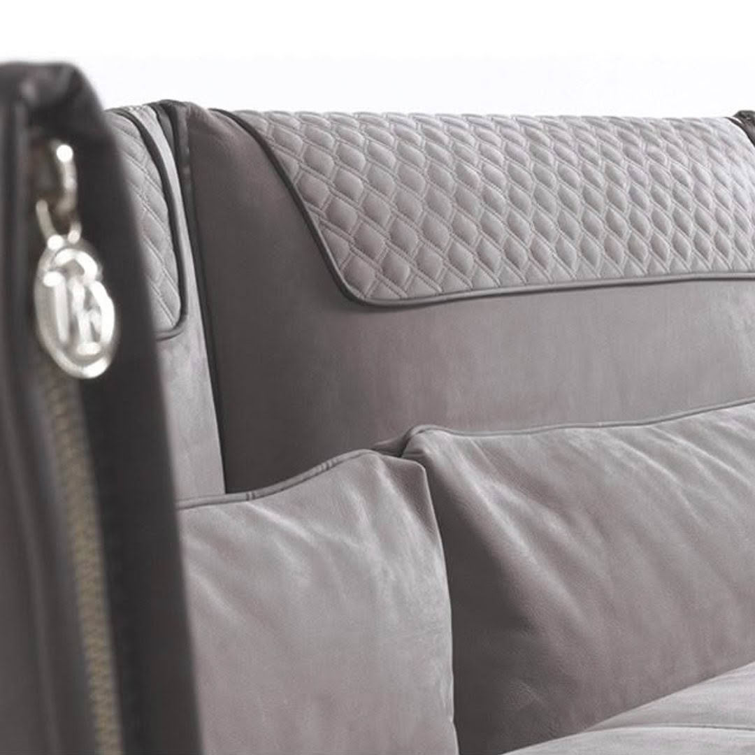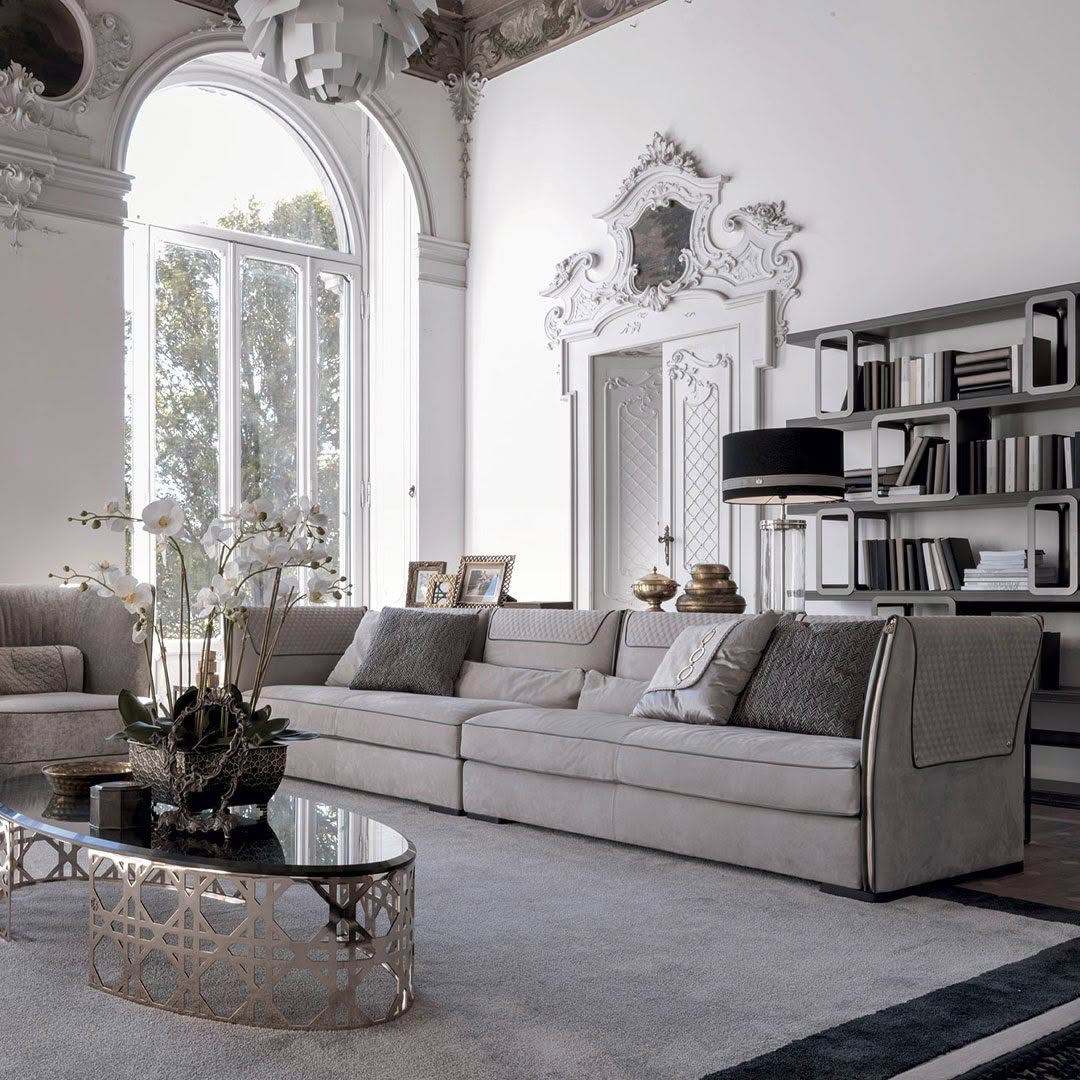 Clivio modular sofa has a design that is both bold and ethereal, thanks to the aerial structure without continuity between armrest and backrest. It is a precious object, to be read on more layers, seeking behind every detail perfection and the desire to excel. Dedicated quilting covers the upper part of the armrests and backrests secured by golden buttons, while integrated lumbar cushions provide additional comfort. The search for the perfect detail culminates in the golden zip, which outlines the profile of the armrest and backrest; the piping, on the other hand, highlights the silhouette and proves Vittoria Frigerio’s care for detail. Clivio is a harmonious fusion of elements that establish a new stylistic rigour.