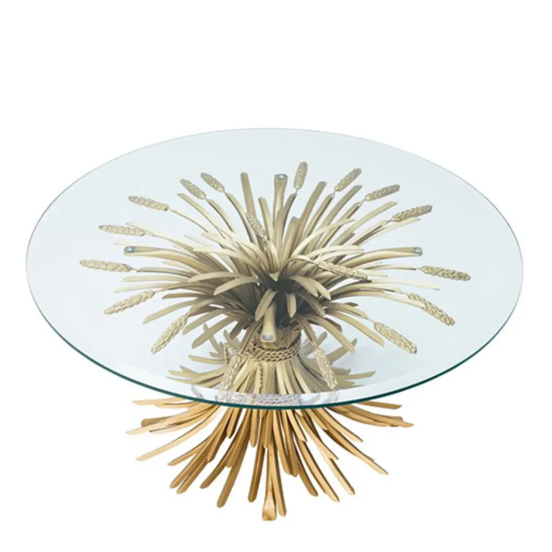 Modern dark wood coffee table with metal frameElegant coffee table with metallic decorative vases