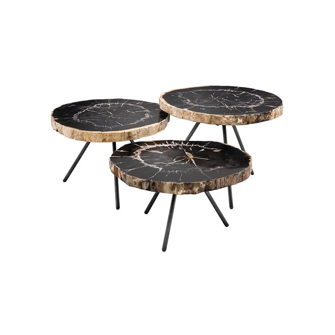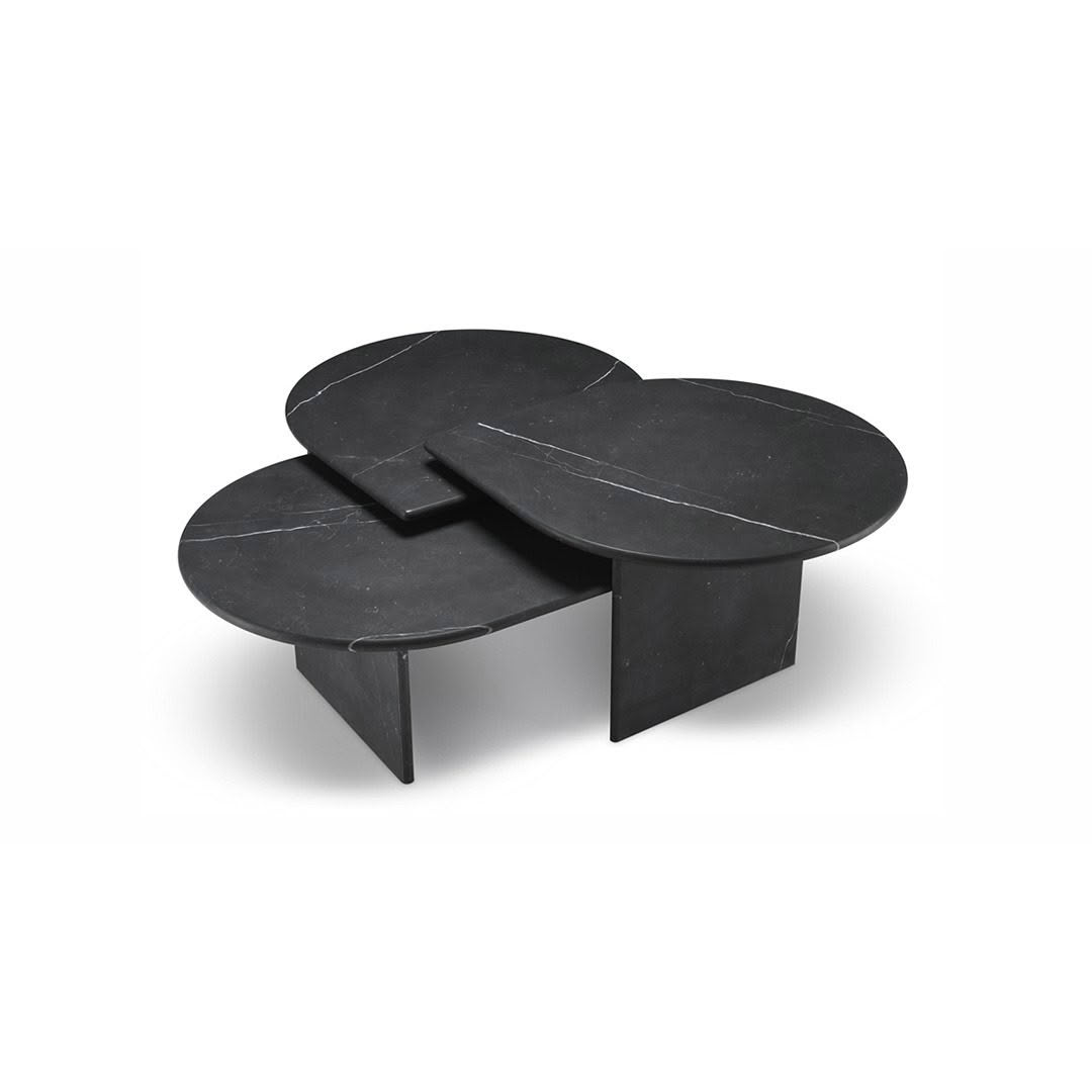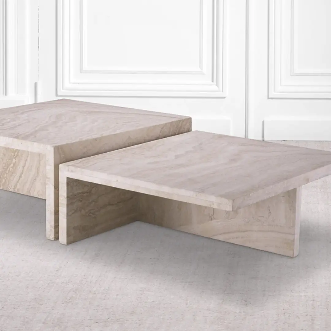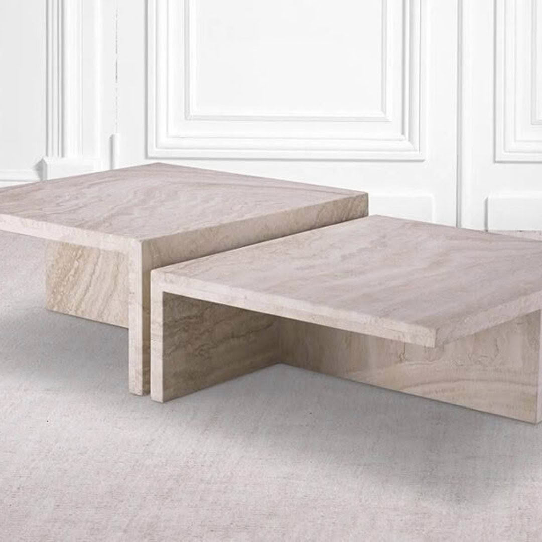 Two modern nesting tables with artistic topsElegant neutral-toned living room with modern furniture