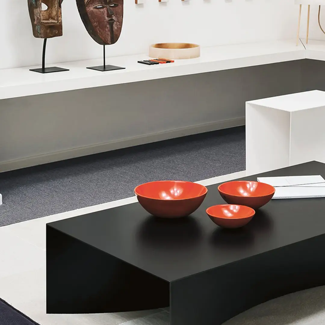Round modern coffee table with black and red finishRound black two-tier coffee table with chrome legs