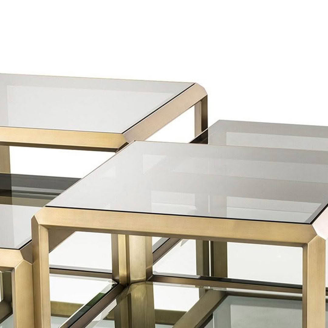Modern glass and metal coffee and side tablesElegant living room with wooden walls and modern furniture