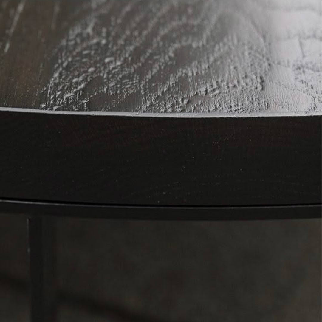 Elegant round table with textured top and metal detailsElegant round side table with books and geometric sculpture