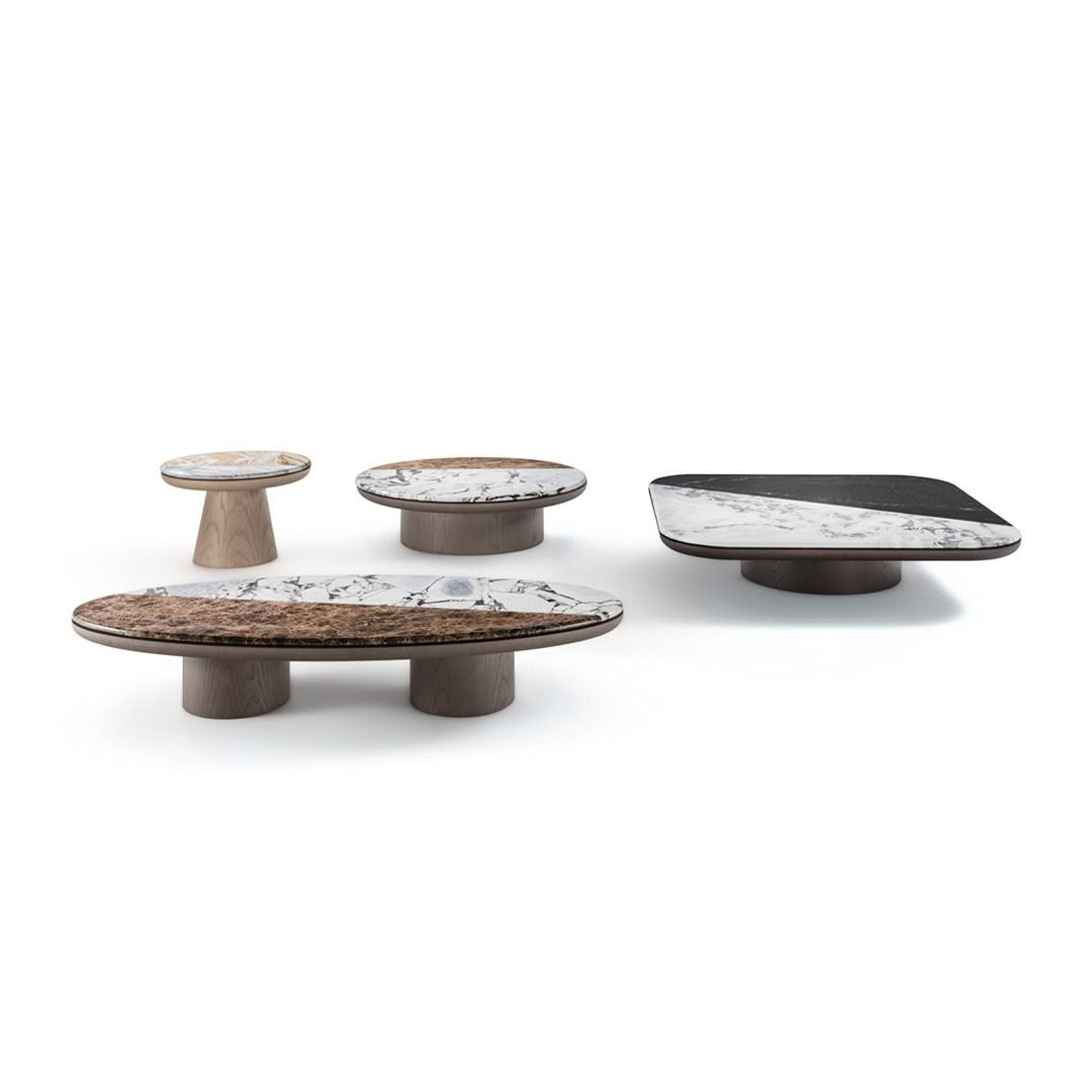 Modern marble coffee tables with cylindrical basesModern living room with plush seating and large windows