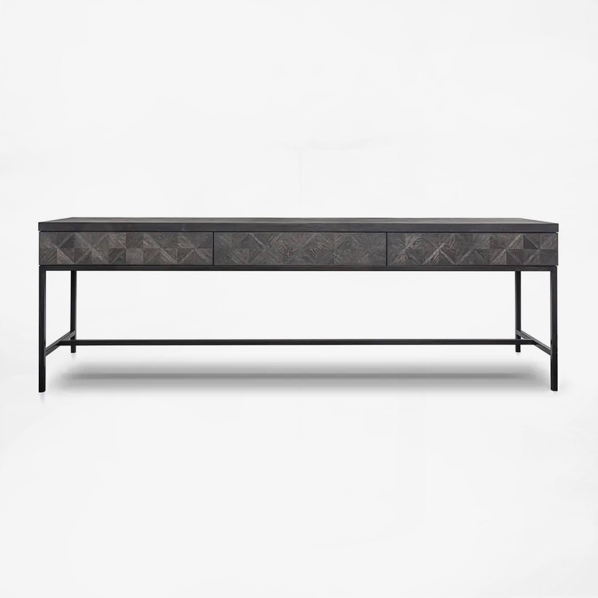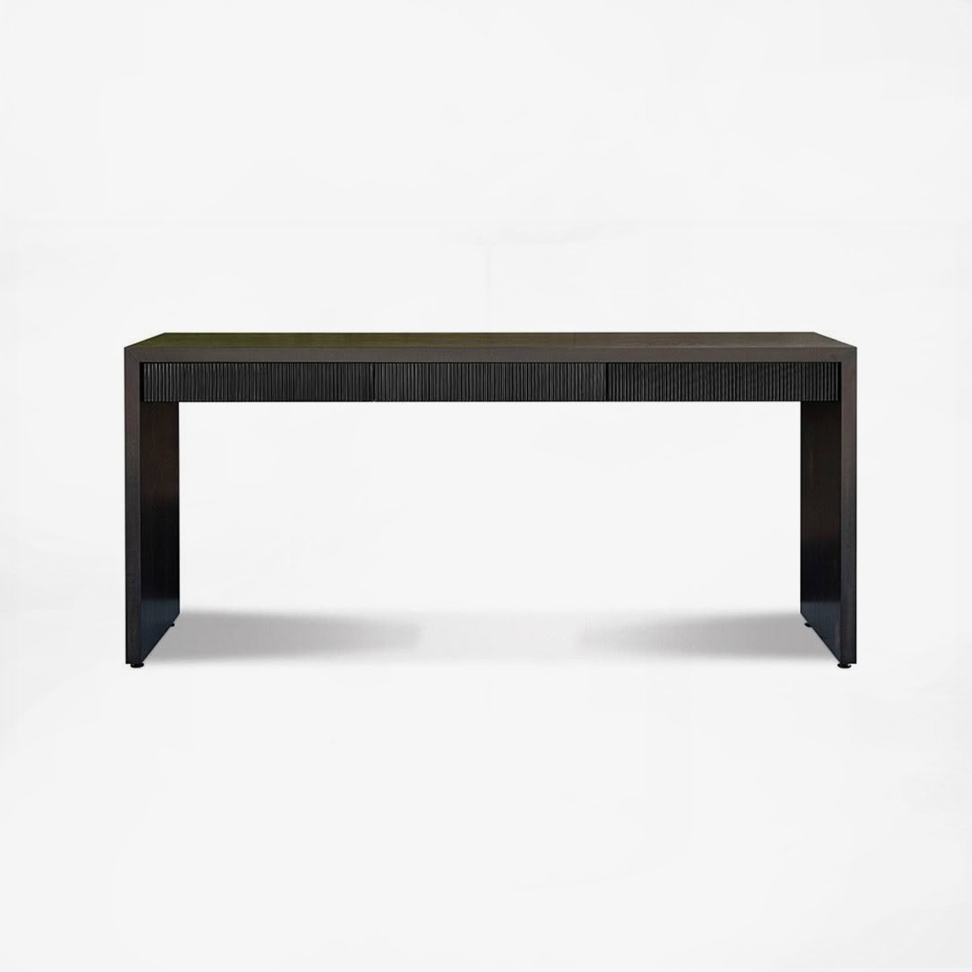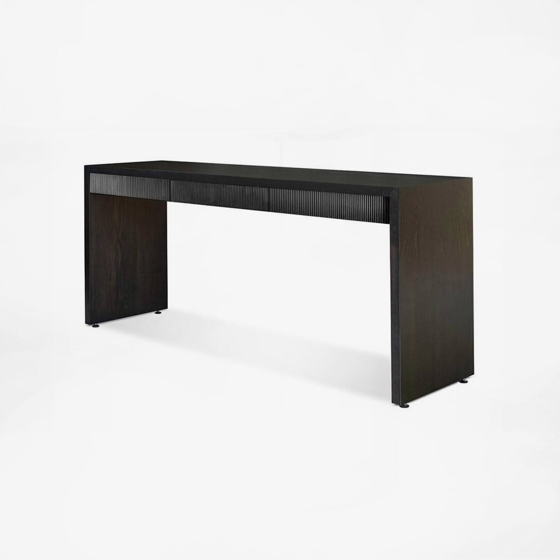 Black modern desk with textured drawers on white backgroundBlack modern console table with metal legs isolated