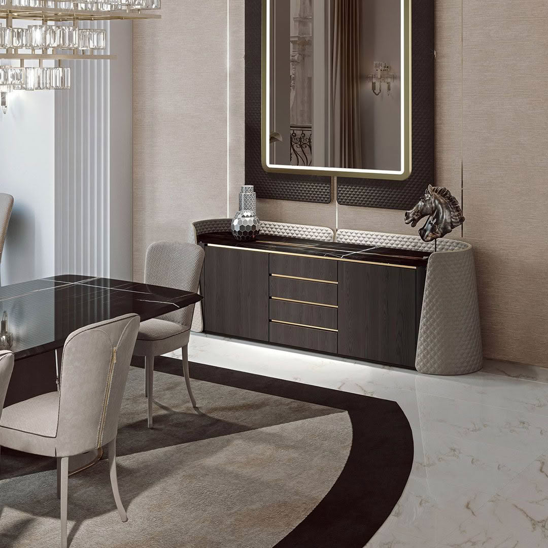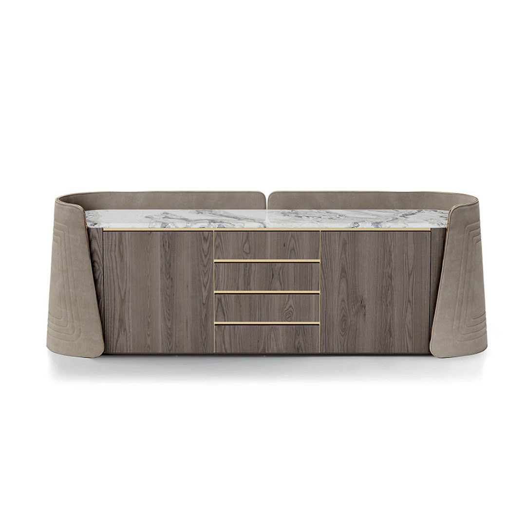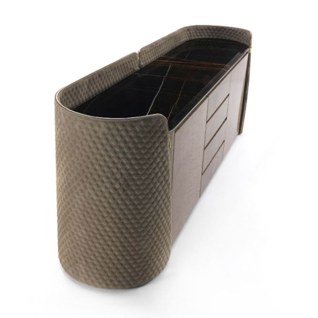 Contarini is a sumptuous yet versatile object. The external structure is available in two versions: Contarini can have the structure enriched with a fine quilting, or, at choice, a delicate embossed embroidery. The combination of the external metal supporting structure, and the marble top makes this sideboard, available in one size, a recognisable piece of furniture in terms of design and richness of details. The quilt is enriched by a gold chrome zip and the wooden drawer fronts further adorn an object that is a masterpiece of craftsmanship and luxury. Contarini is also available in a chest of drawer version.