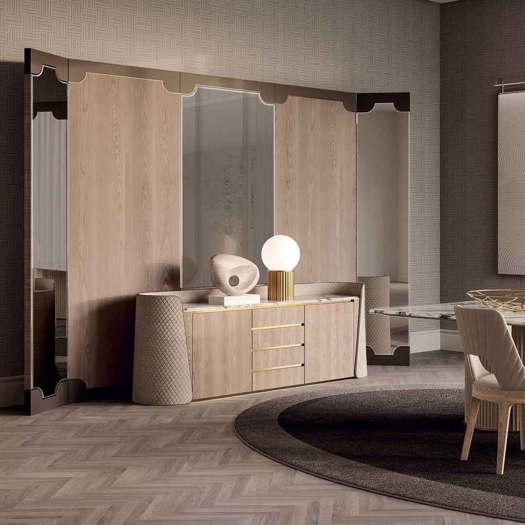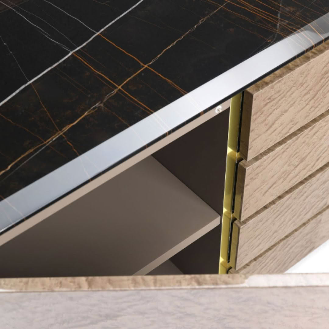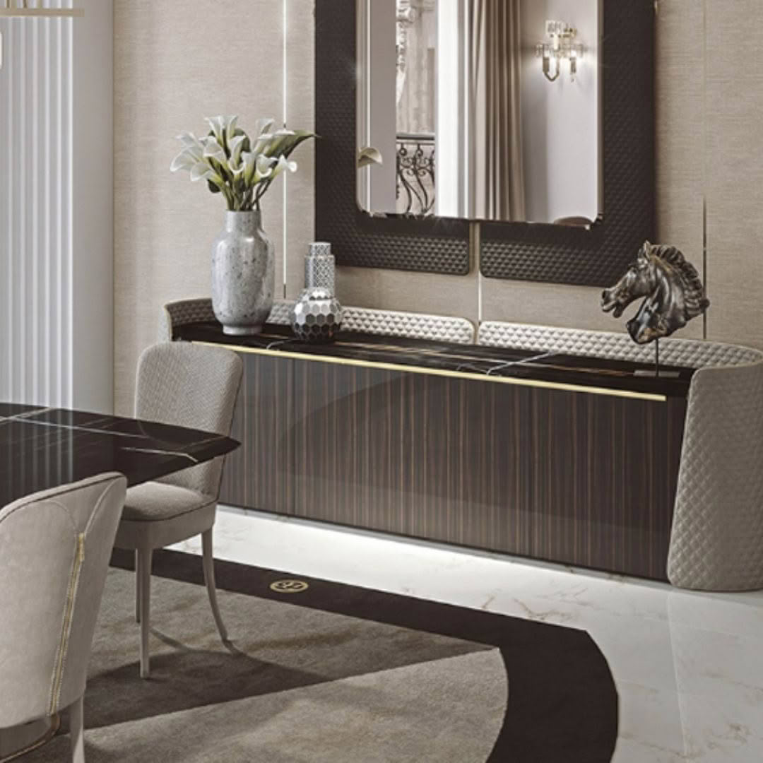 Contarini is a sumptuous yet versatile object. The external structure is available in two versions: Contarini can have the structure enriched with a fine quilting, or, at choice, a delicate embossed embroidery. The combination of the external metal supporting structure, and the marble top makes this sideboard, available in one size, a recognisable piece of furniture in terms of design and richness of details. The quilt is enriched by a gold chrome zip and the wooden drawer fronts further adorn an object that is a masterpiece of craftsmanship and luxury. Contarini is also available in a chest of drawer version.