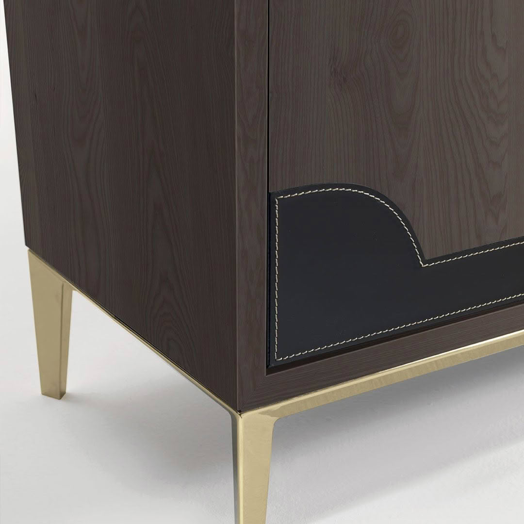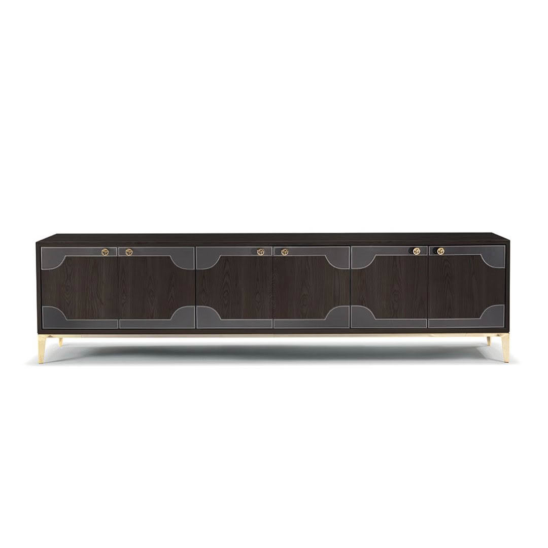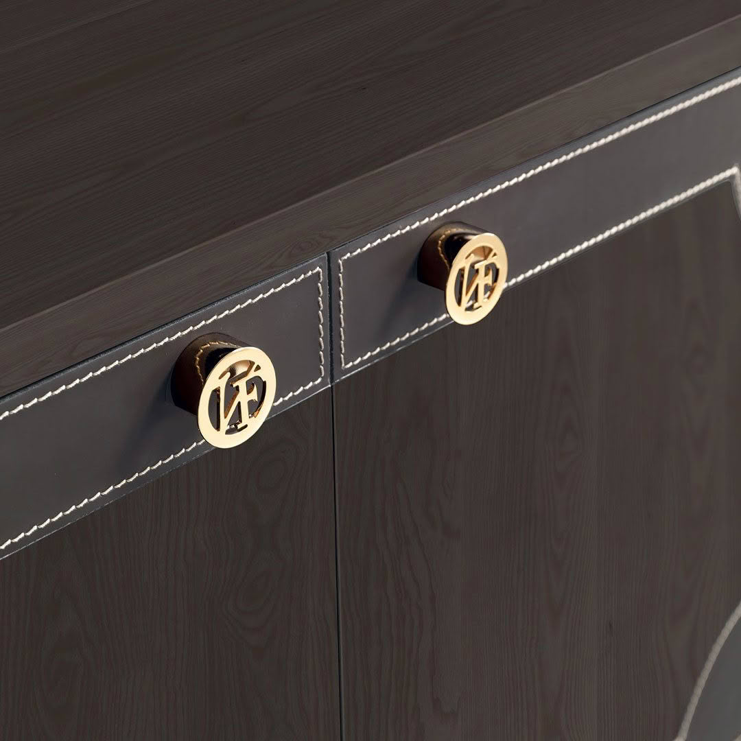 Crivelli sideboard is characterised by a wooden structure with refined leather door inserts to mark its profiles and a metal base in the colours of the VF collection, which lifts the structure off the ground. VF logo metal handles enrich the sideboard doors. The precious details of the cabinet contrast with the rigorous lines for an austere and elegant result that furnishes every area with taste and class.