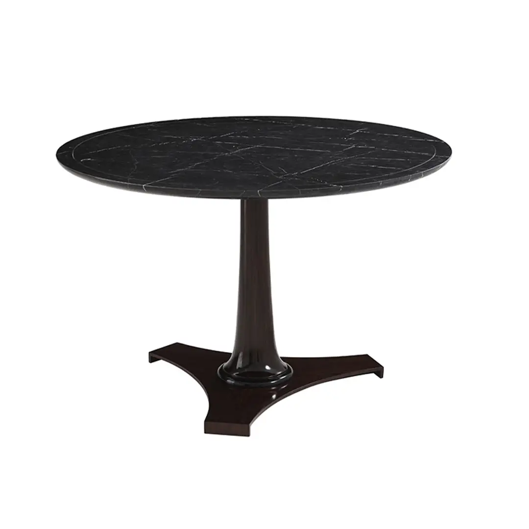 Round wooden pedestal dining table on square baseRound wooden pedestal dining table on white background