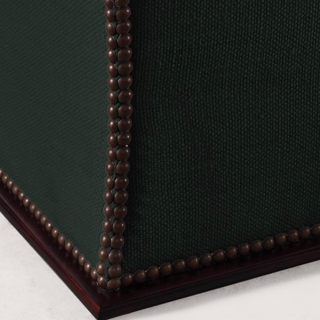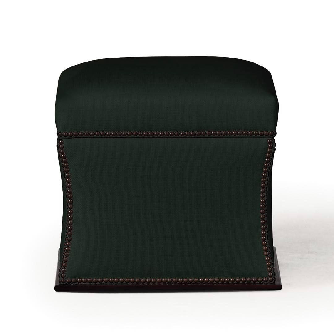 Drawing inspiration from early Victorian forms, the Florence ottoman showcases elegant contours trimmed with gleaming nail-heads. The whimsical silhouette is paired with a removable top cushion, which can be lifted to reveal interior storage.