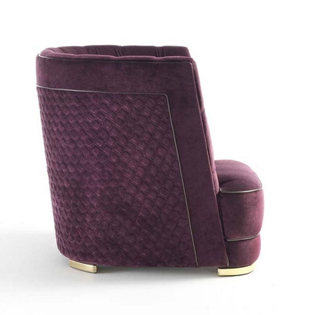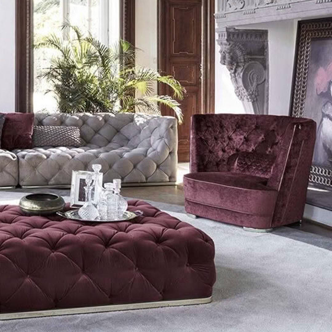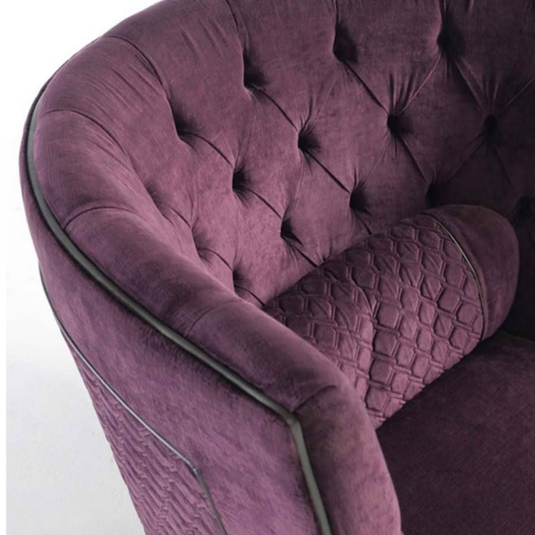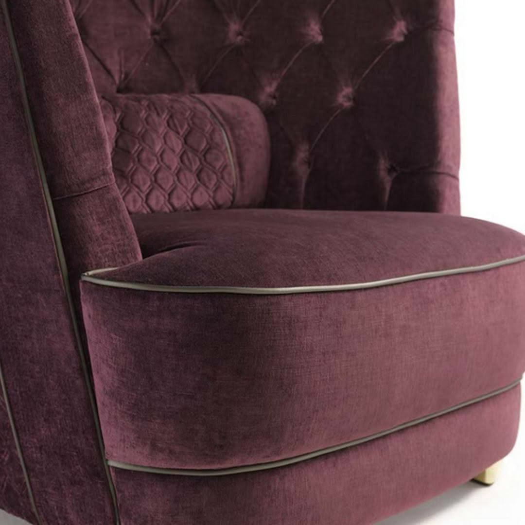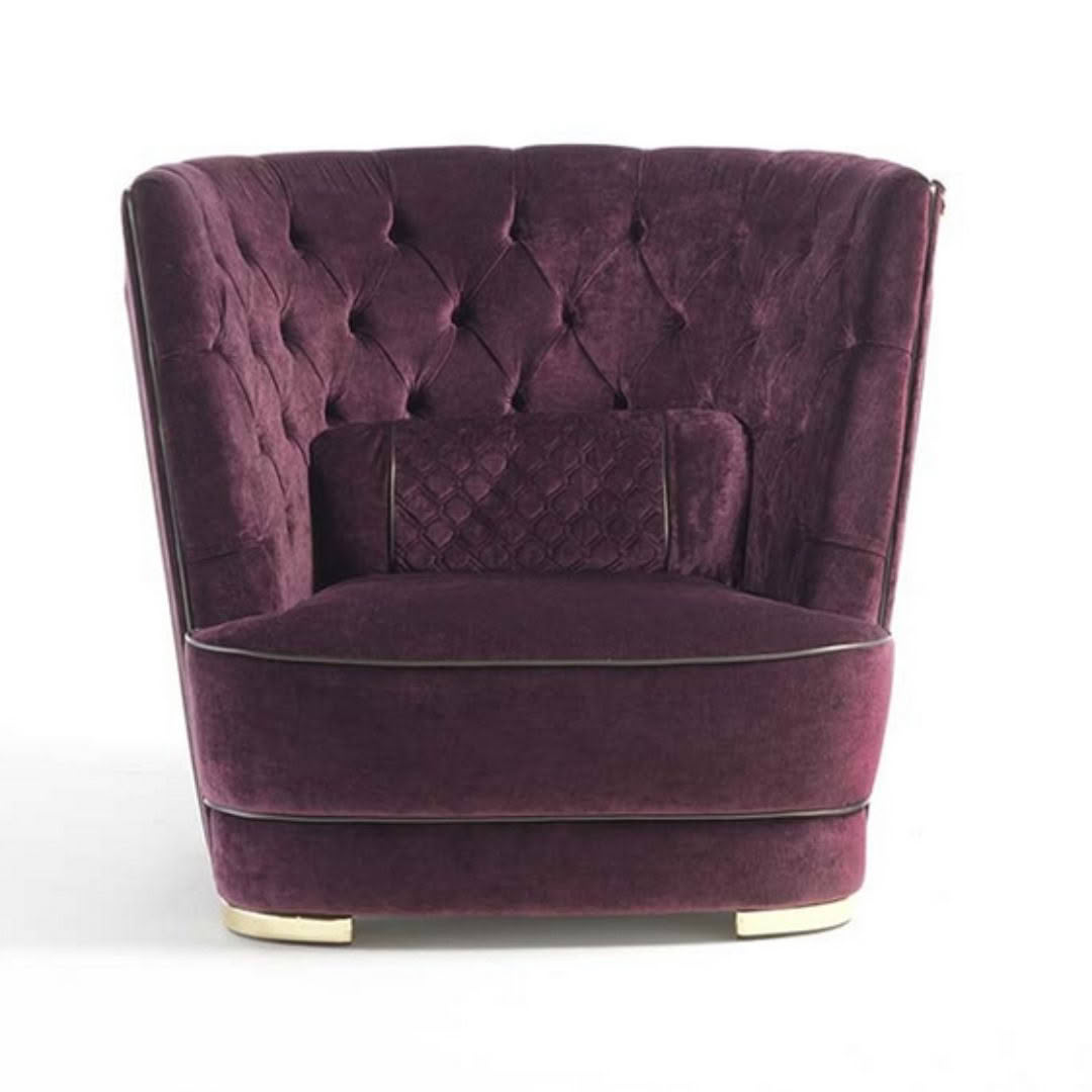 This armchair is a blend of sumptuous regal shapes and the elegance of the ancient handicraft that is button tufted upholstery