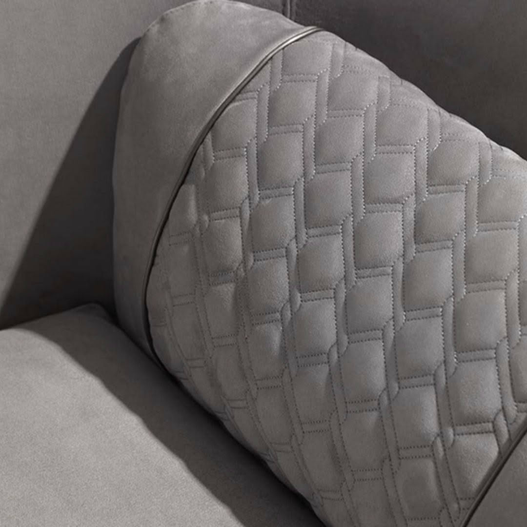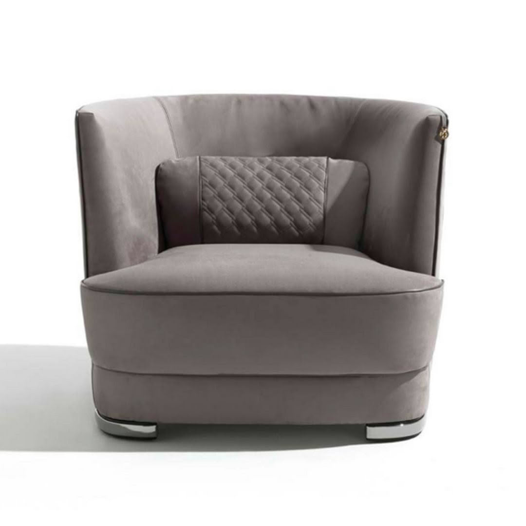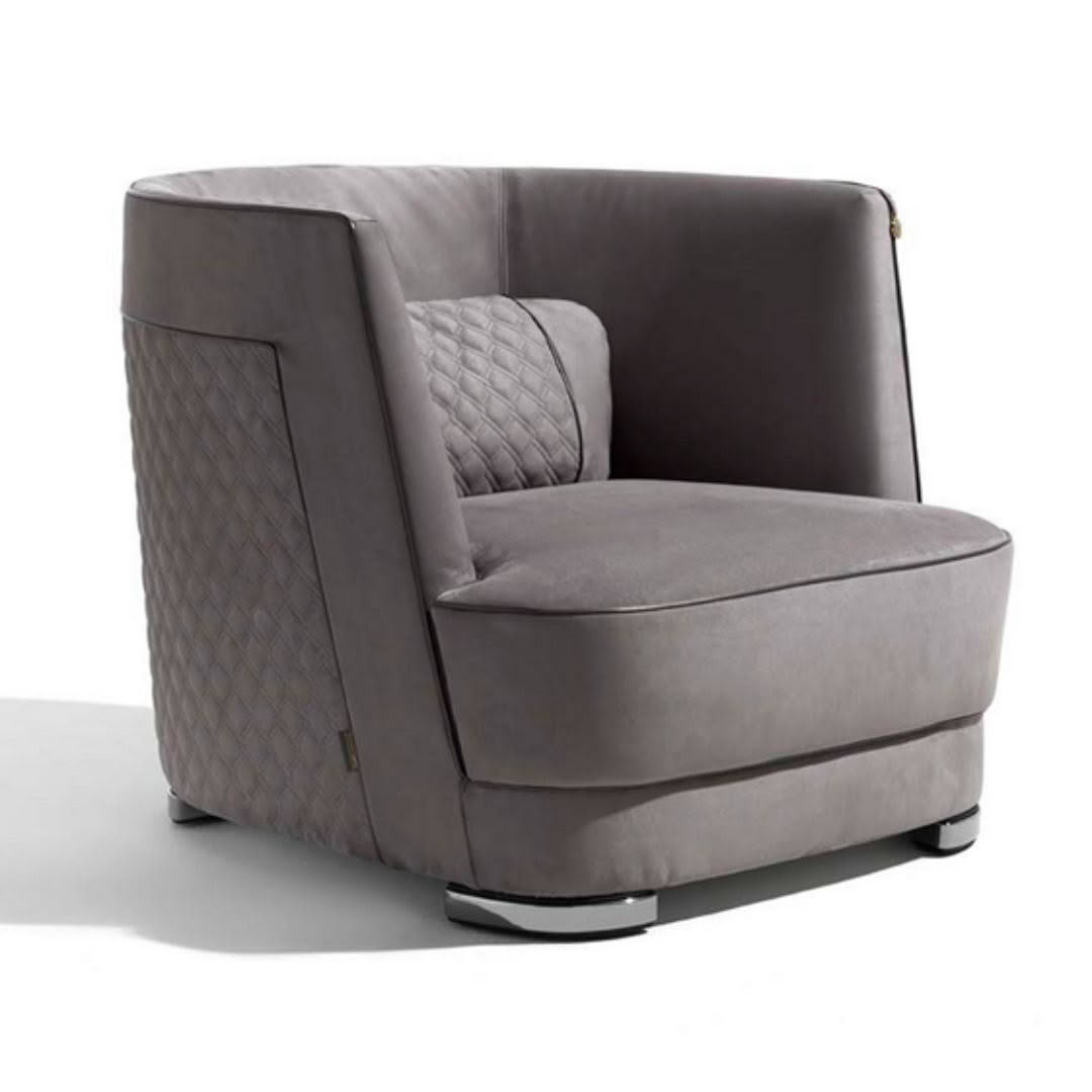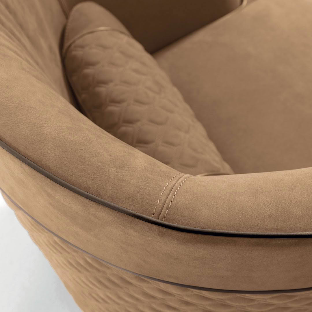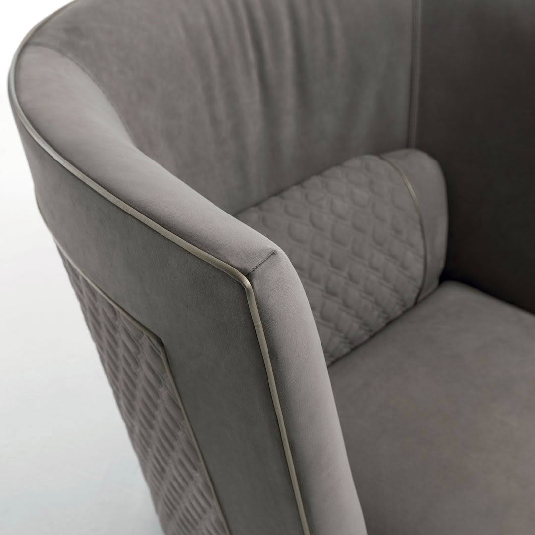 The Greppi armchair, available in two backrest heights, at 74cm in the Low version and at 88cm in the High version, highlights balanced proportions for a nest effect thanks to the full-height enveloping backrest. The quilted inserts on the outside of the backrest and on the integrated lumbar cushions are an example of the tailoring of the Vittoria Frigerio collection. A timeless object, albeit extremely current in proportions and materials.