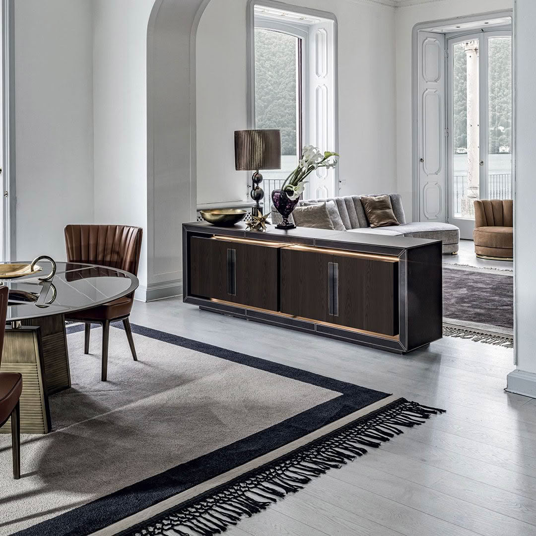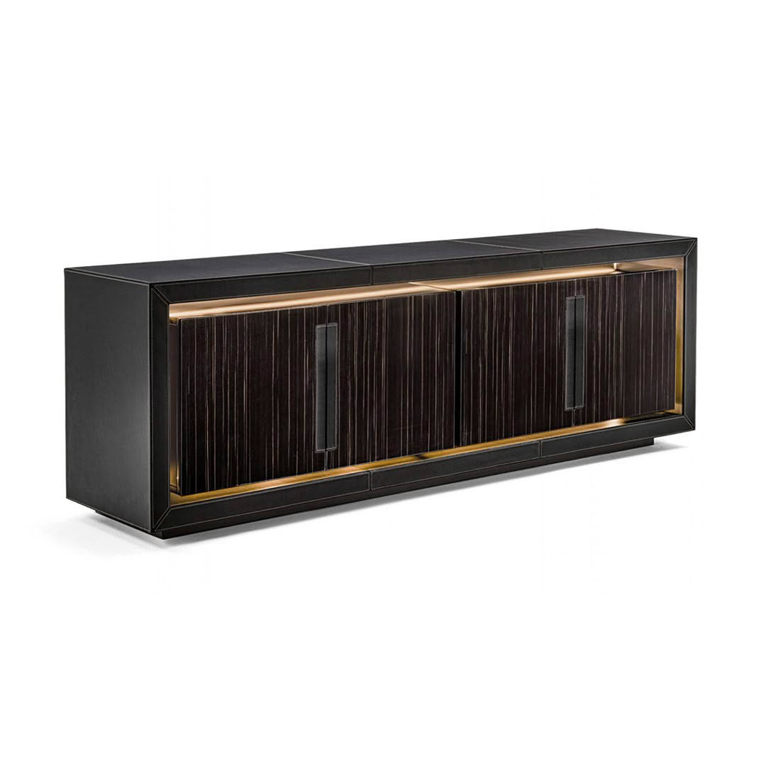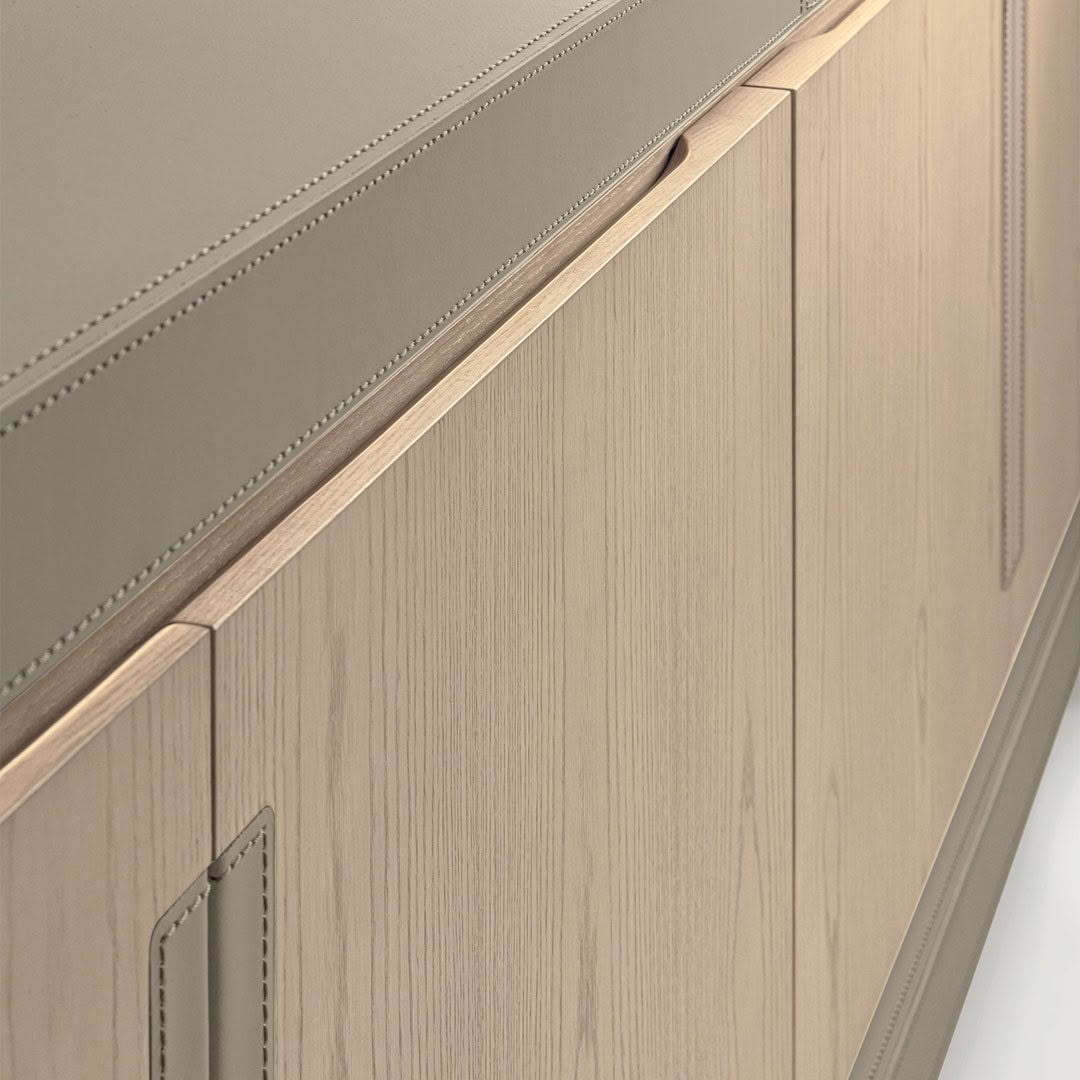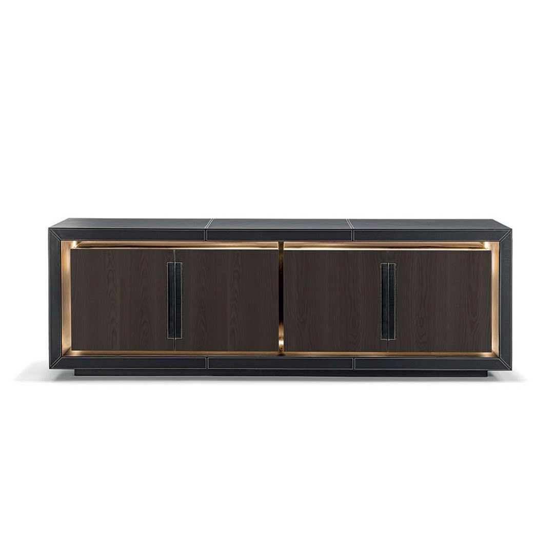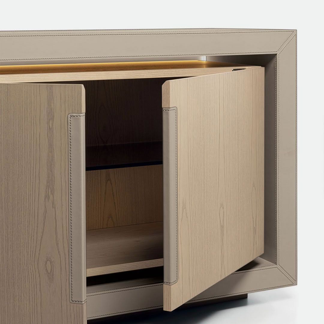 Collection of furniture in different shapes and dimensions. External structure in wood covered in hide leather, with availability of internal led lights lighting the internal module suspended, made in wood available in the following finishes: Noce Dark coloured, ebony glossy or matt, erable glossy or matt. The internal of the module is lacquered in matching colour.