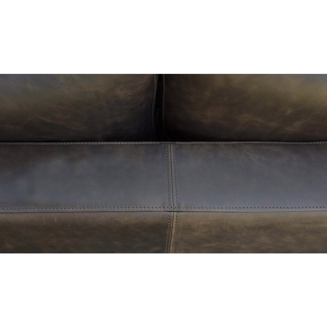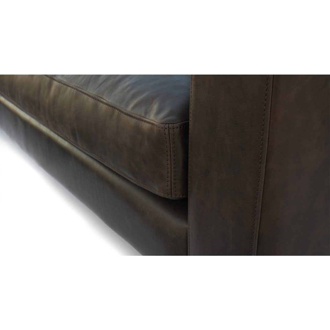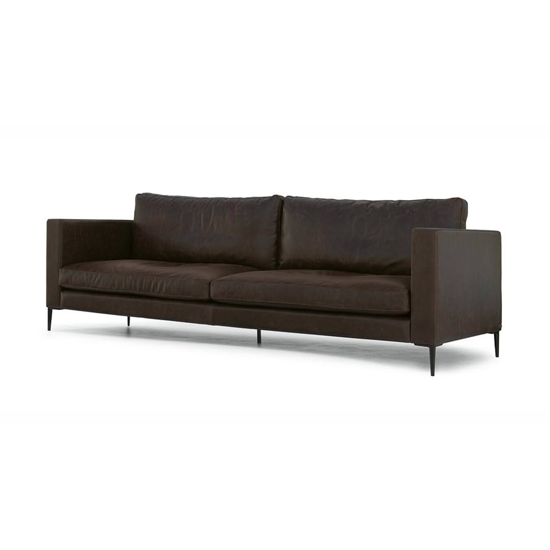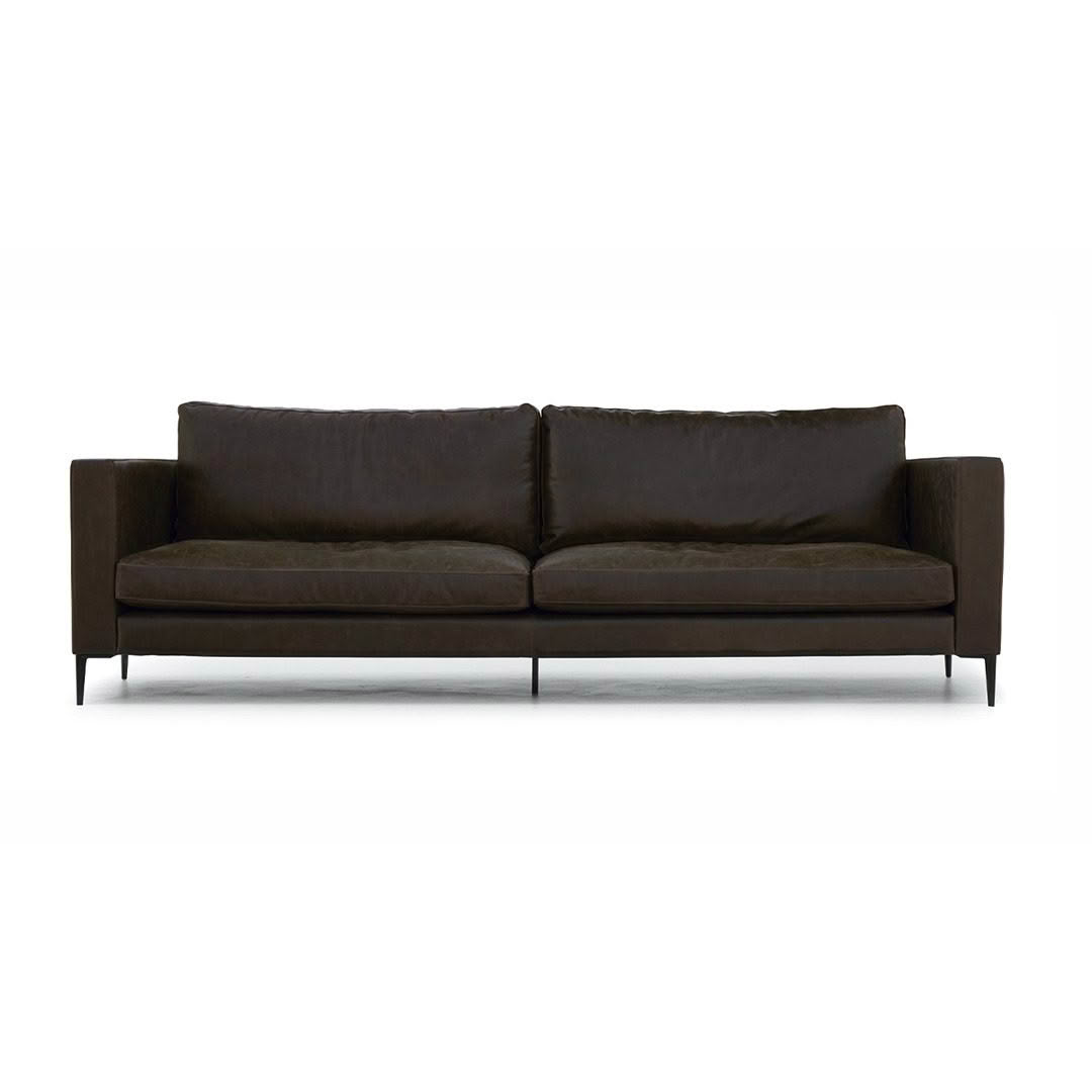 The Modena sofa with relaxed back cushions filled with soft feathers, medium width arms and fine matt black metal legs is a casual and comfortable style sofa. Custom made in New Zealand in your choice of fabric or leather.