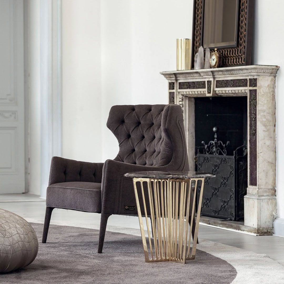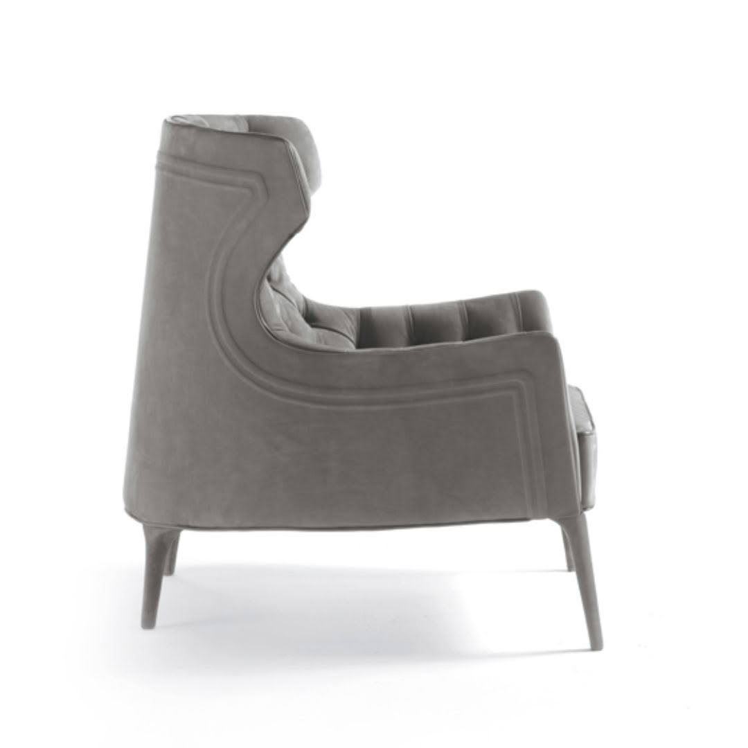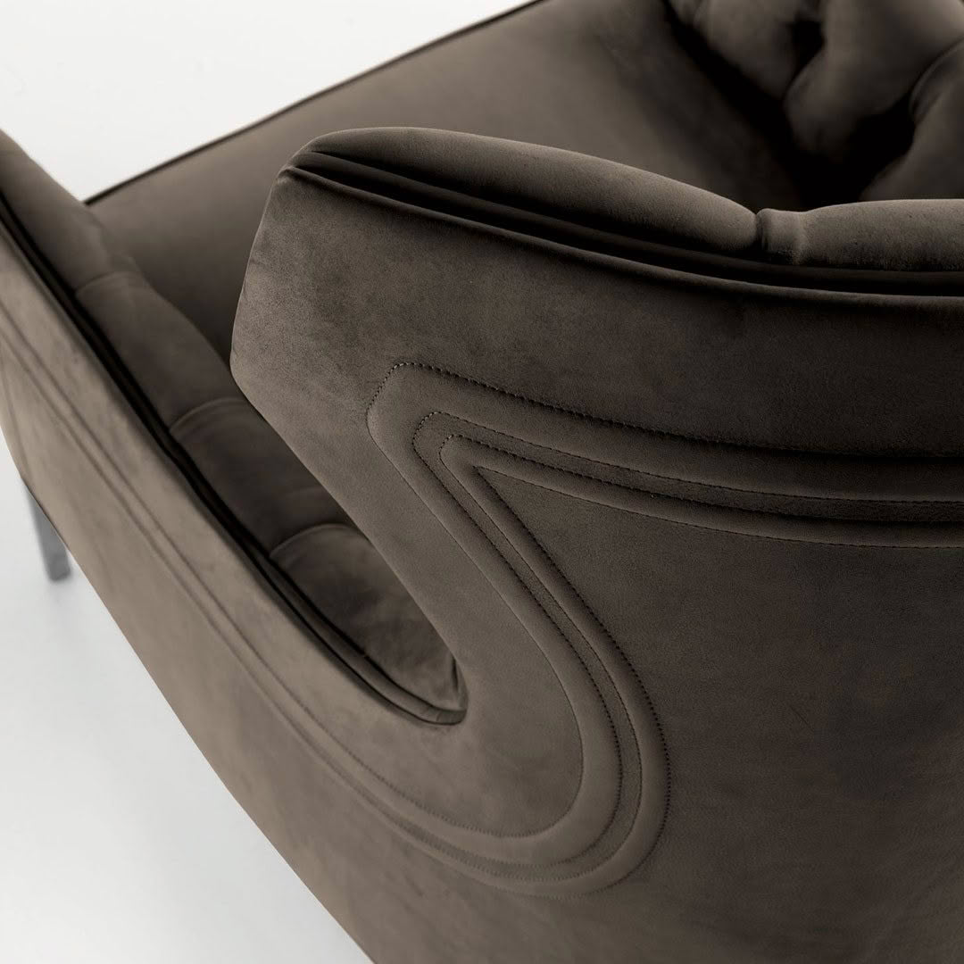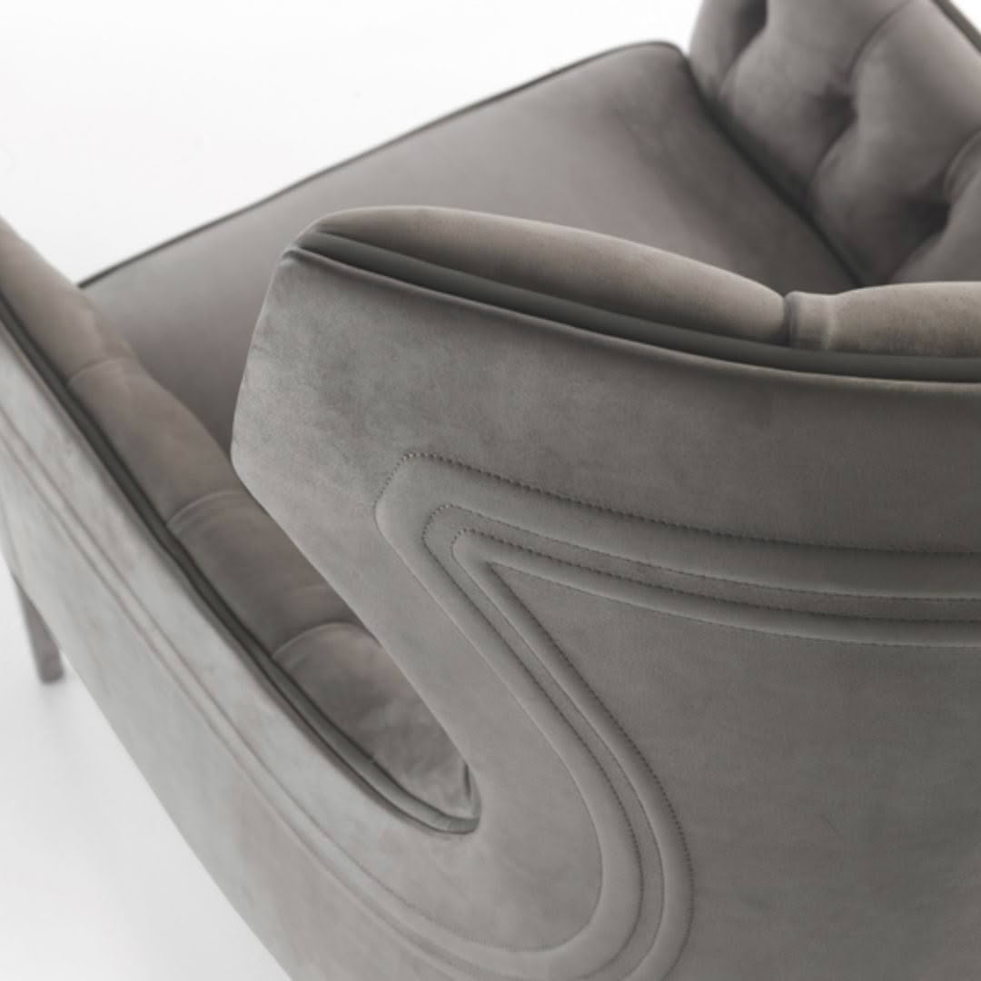 Perfect for reading and relaxing, an armchair whose forms are sober and elegant, and embellished with an embroidered backrest