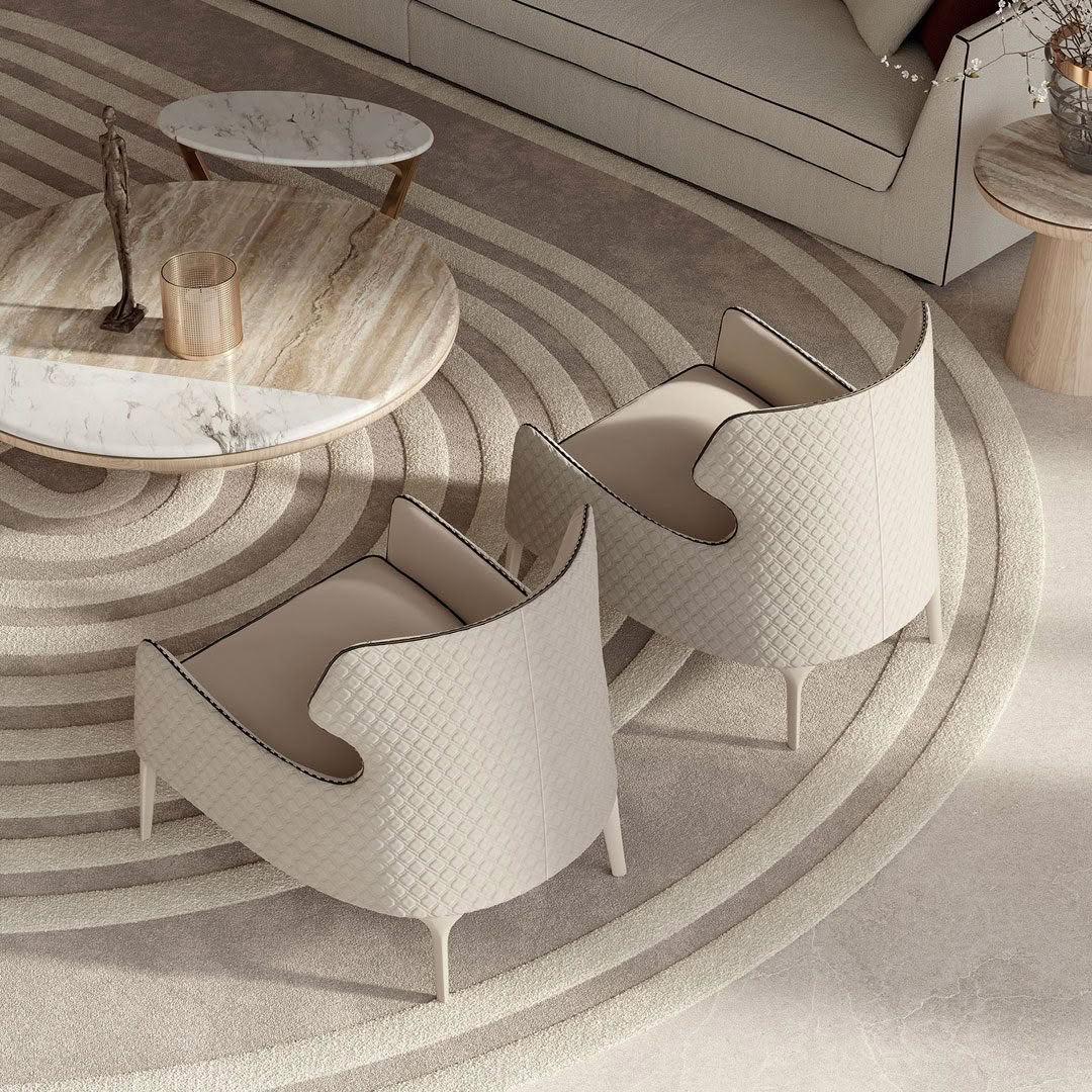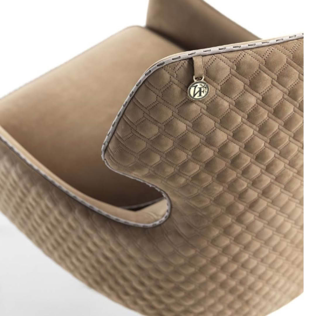 Some silhouettes are so unmistakable that they become true icons. In the Vittoria Frigerio collection, the Piola family enhances the uniqueness of the design that characterizes it with different shades and details: a thin curved line that outlines the structure with a decisive and uninterrupted line that transforms into a backrest with enveloping wings. The Piola armchair, the quintessence of the family whose name it bears, develops in a balanced way, enhancing the shapes thanks to the quilted insert on the outside and a hand-stitched profile with contrasting thread. A further touch of originality is given by the button-pendant in chrome gold or black chrome with the VF logo. Finally, the bergere version develops its shapes along the height of the backrest, enhancing its proportions and creating an even more enveloping effect.