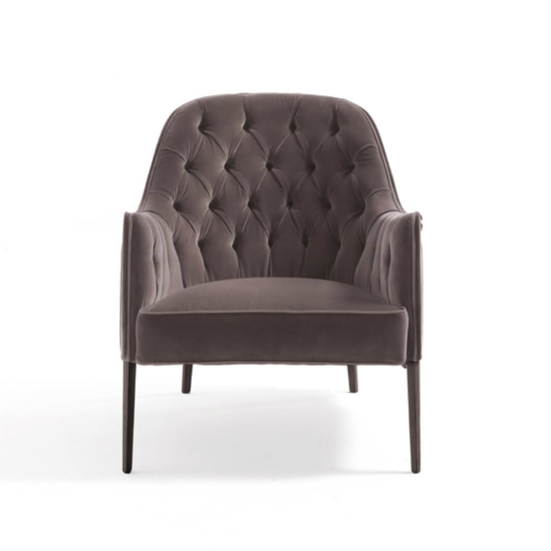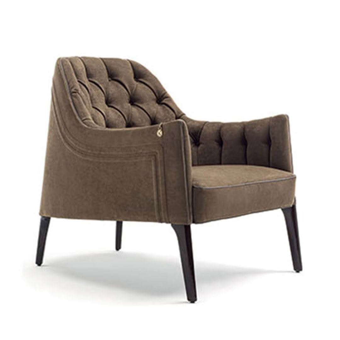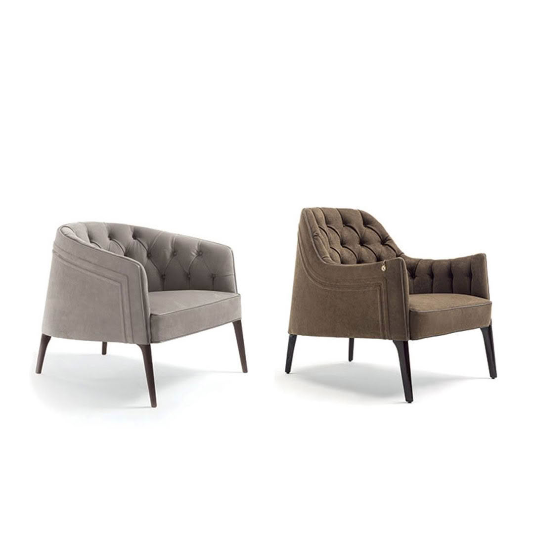 Poggi Capitonné armchair, with a cone section and a backrest that gently merges with the armrests, is a true passe-partout that furnishes both day and night areas with sophisticated elegance. The enveloping seat is an invitation to rest; the capitonné manufacturing on the internal backrest gives a regal flair and creates an elegant contrast with the delicately embroidered external backrest. The solid wood feet with their textured effect lift the armchair for a light and pleasant visual effect. Poggi Capitonné is also available in a bergère version where the curve of the backrest gently glides into the armrest like a wave, creating a comfortable and enveloping seat, yet with a strongly contemporary design.