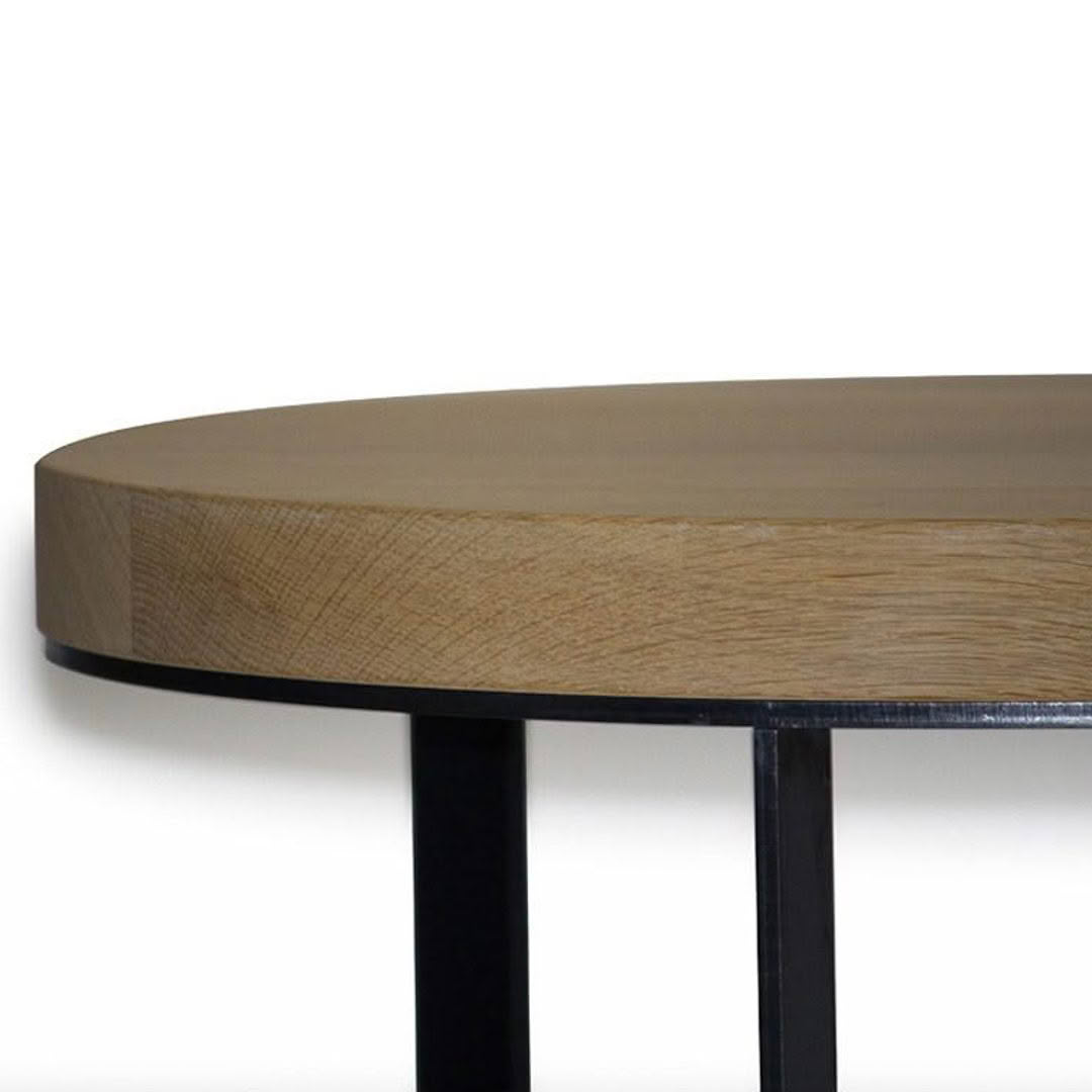 Ted lamp table with round top in solid American Oak, Also Available in MDF. Blue gun steel base with 3 legs.