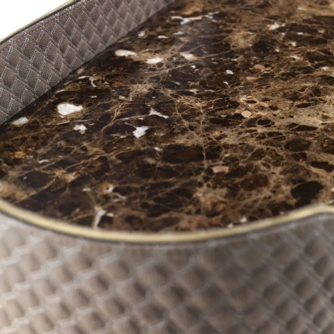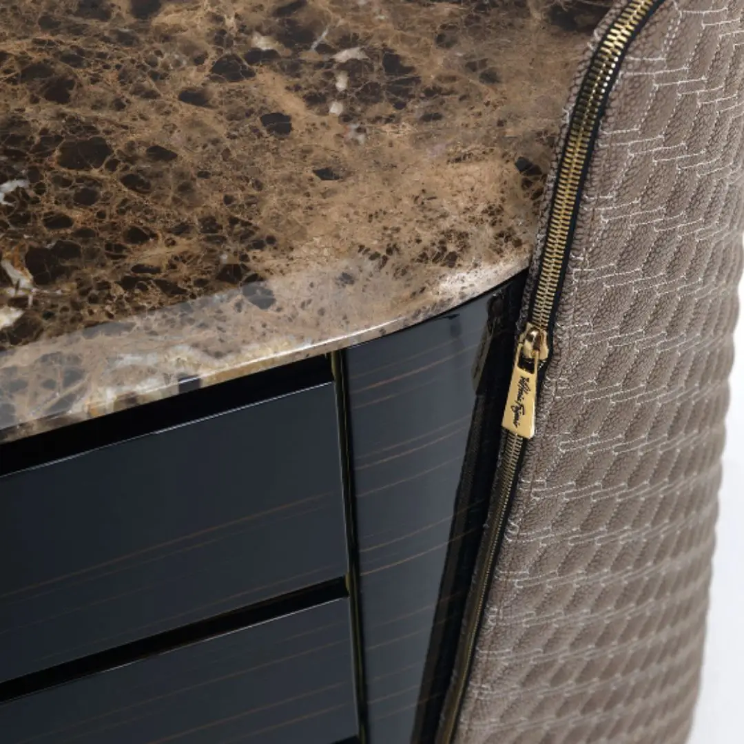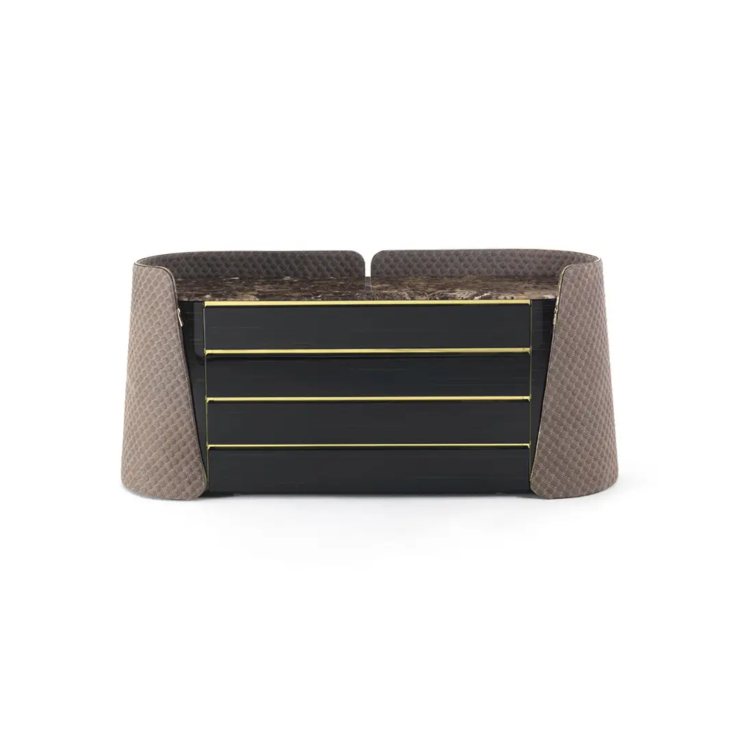 Contarini is a sumptuous yet versatile object. The external structure is available in two versions: Contarini can have the structure enriched with a fine quilting, or, at choice, a delicate embossed embroidery. The combination of the external metal supporting structure and the marble top makes this sideboard, available in one size, a recognisable piece of furniture in terms of design and richness of details. The quilt is enriched by a gold chrome zip and the wooden drawer fronts further adorn an object that is a masterpiece of craftsmanship and luxury. Contarini is also available in a sideboard version.