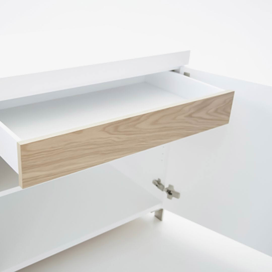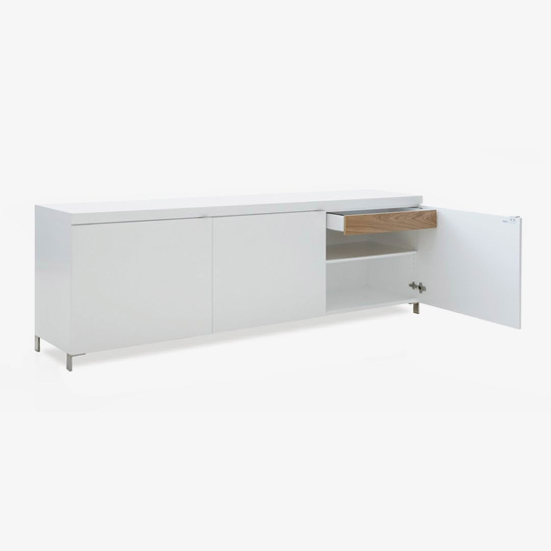 The POLO sideboard is distinguished by a thick top complimented by brushed stainless handles and feet. It is available in various sizes with adjustable shelves, internal cabinet drawers and soft close hinges. Exclusively made in New Zealand in American Oak or MDF and finished in any of our timber finishes.