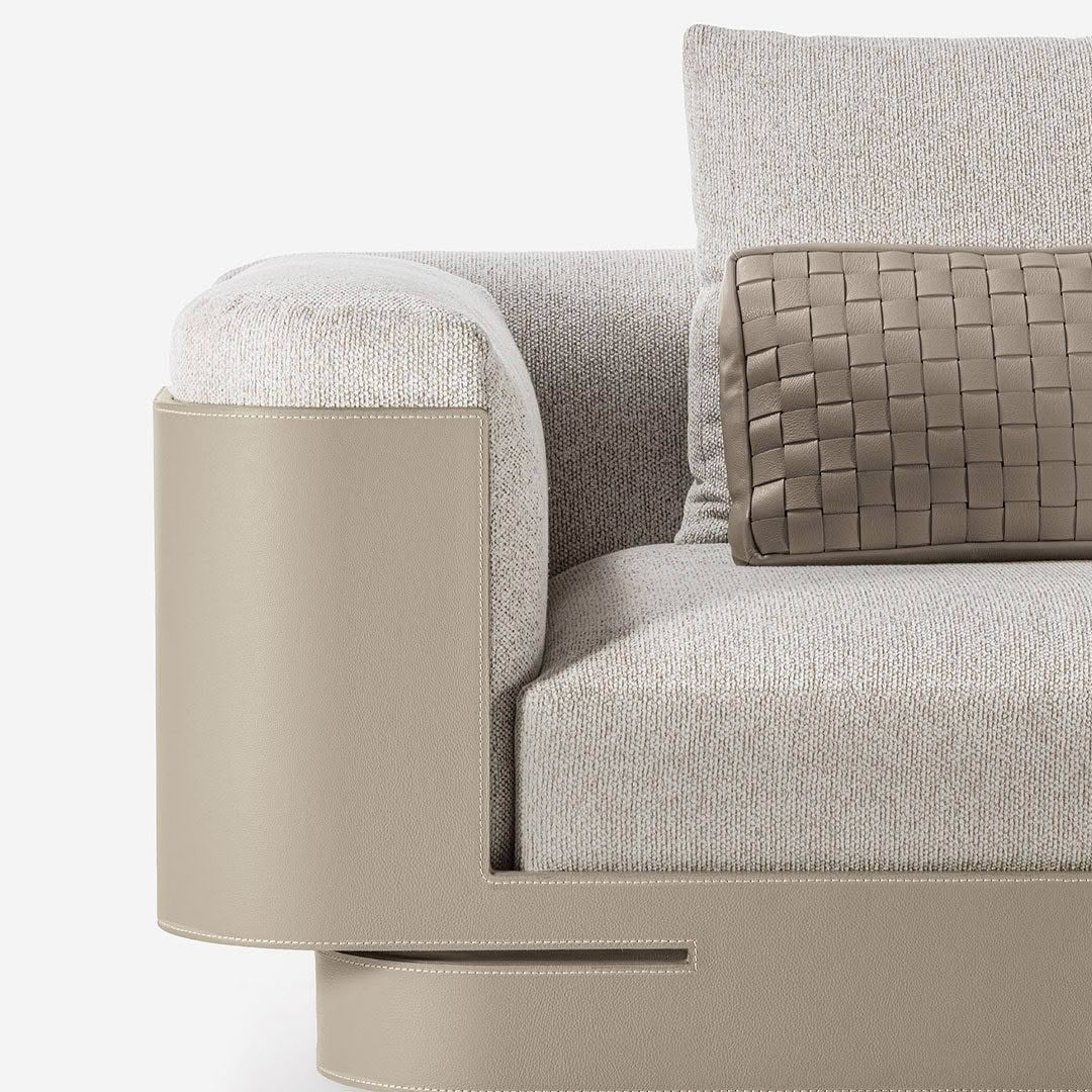 The new modular Necchi sofa, design by Andrea Bonini, reflects the architect’s creative flair and design signature. Through apparently simple shapes, Bonini’s work aims to create sensual and luxurious environments through meticulous attention to details. Necchi sofa features a strong geometrically shaped base, covered in leather, which extends into the front of the armrest like a shell of beauty, with a precious interplay of volumes and materials. The rigorously shaped base meets the softness of the seat and back cushions. The architectural approach of Necchi sofa becomes a precise statement of enchanting timeless elegance, thanks to the use of different materials and the detailing of overlapping volumes. The modular sofa Necchi allows the realization of unique and bespoken layouts, ranging from classical linear solutions up to more complex ones.