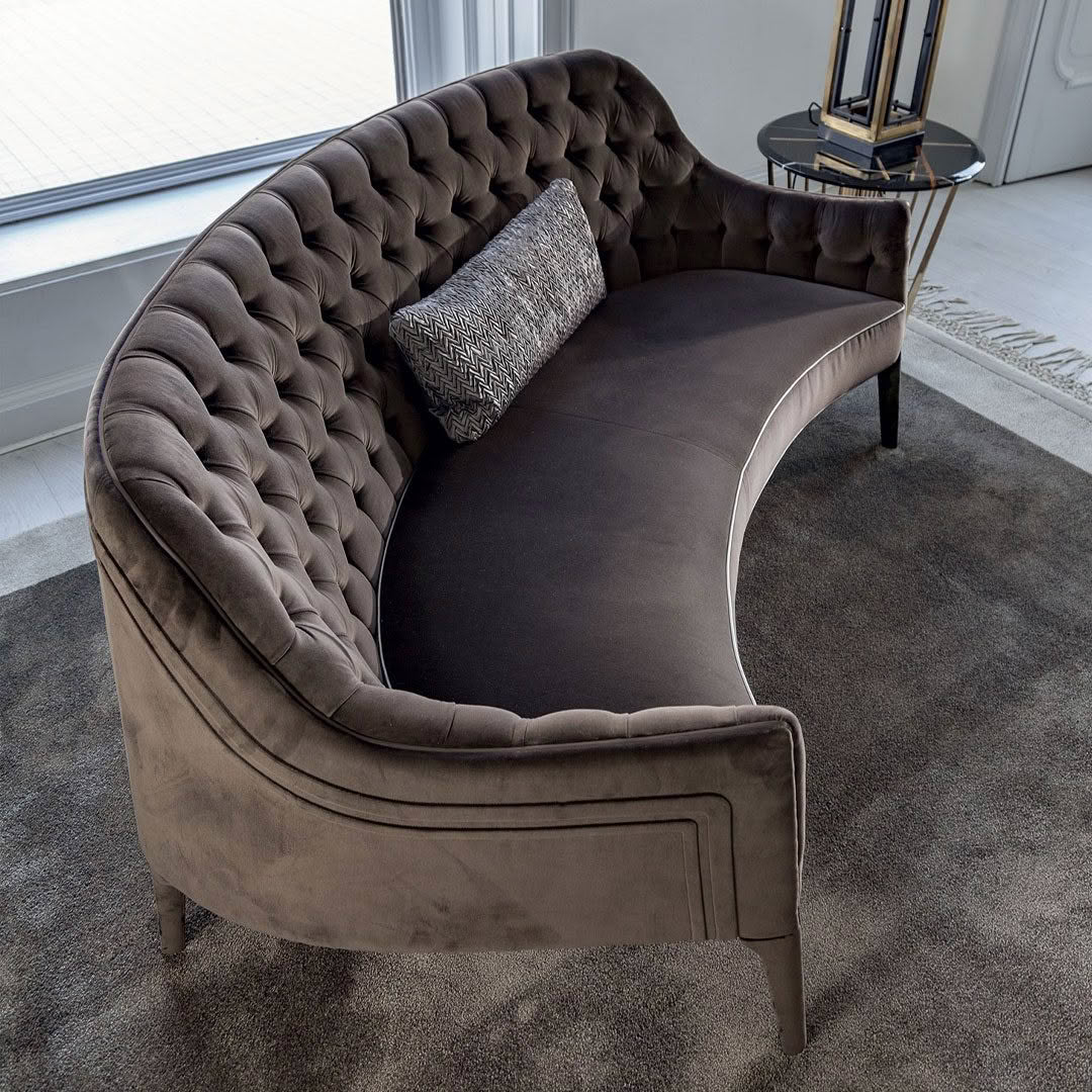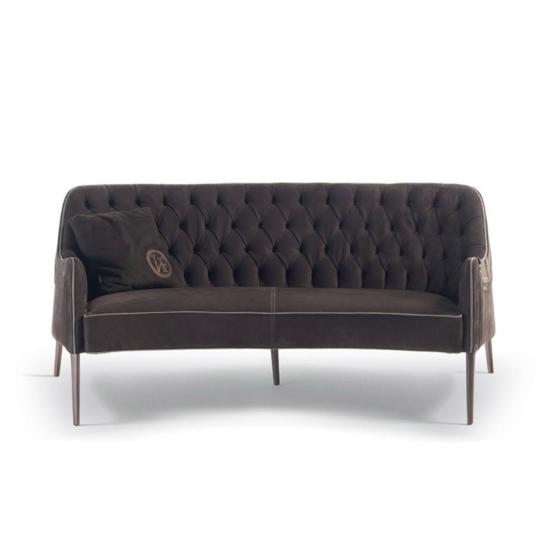 Poggi Capitonné small sofa, available in one size only, is a classic icon of the Vittoria Frigerio collection that fluidly furnishes different environments with unrivalled lightness, as it embodies a transversal concept: an elegant piece of furniture in an entry area, or a cozy sofa for domestic space dedicated to privacy and relaxation. The capitonné finish on the internal backrest and the special embroidery on the external backrest turn the small sofa into a luxury object, capable of furnishing even the most sumptuous spaces. Its curved shapes enhance the aristocratic lines, enriched in the backrest by a quilted insert. Slim solid wood legs give breath to the compact structure of the sofa, lightening its visual weight. Poggi Capitonné is also available in the bergère version, which emphasizes the sofa’s silhouette, making it everlasting.