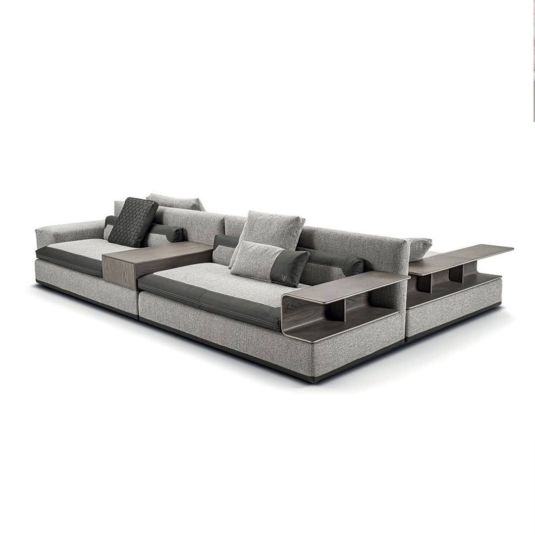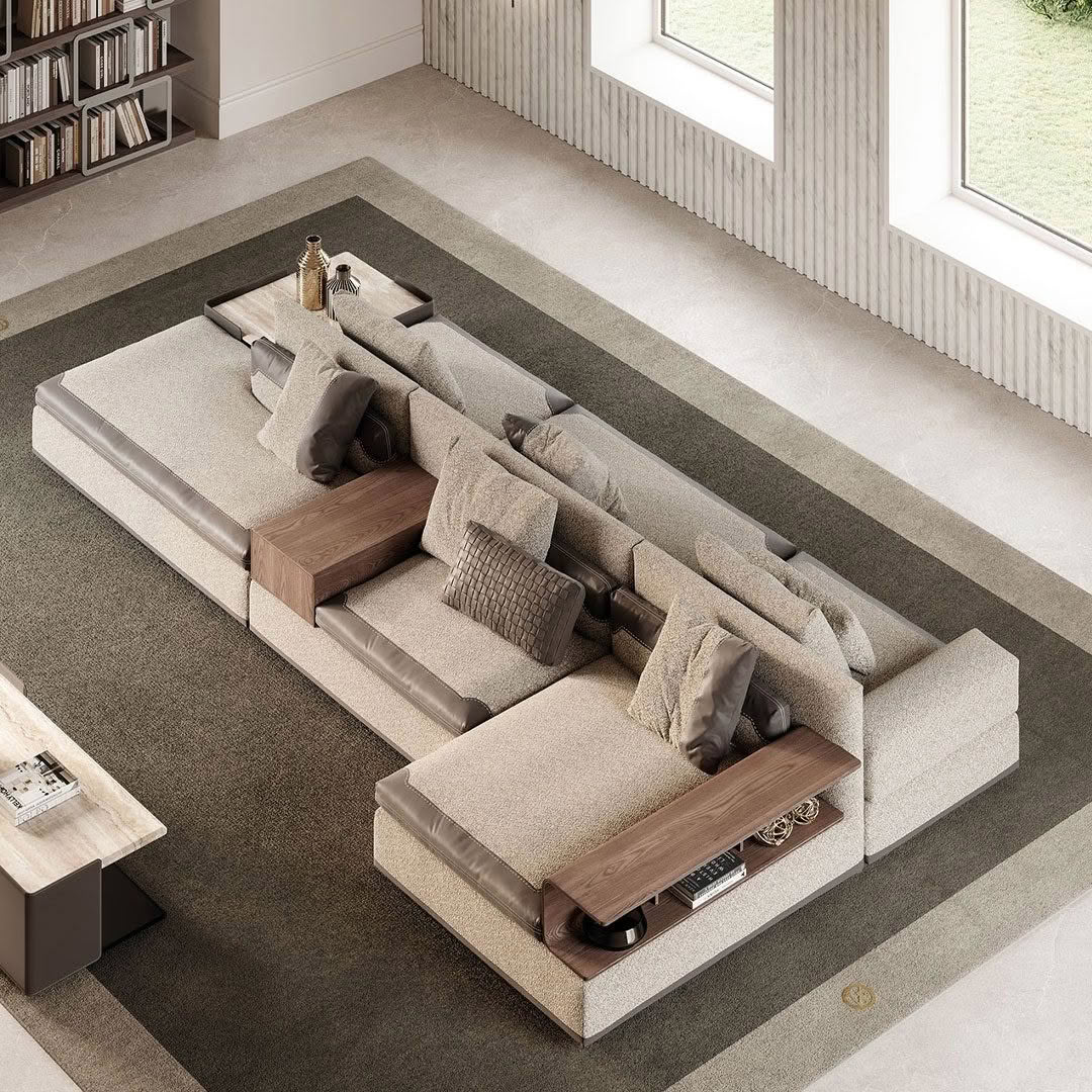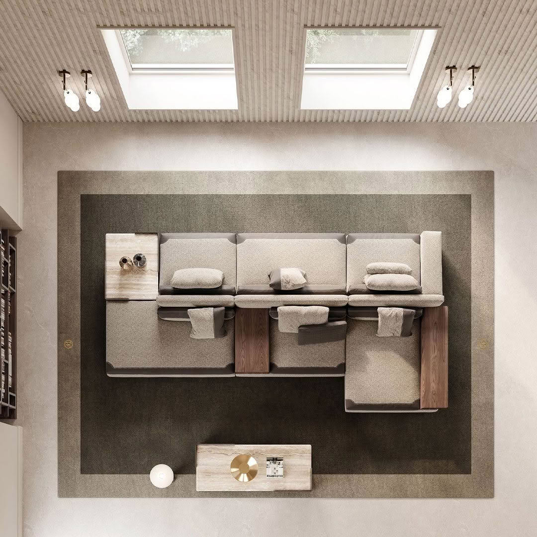 Spinola modular sofa, from Vittoria Frigerio luxury collection, seeks in its simple, clean lines a rigorous formal perfection that matches the soft seat and back cushions, for a sophisticated contrast of textures and details. The geometric structure is enhanced by the seat cushions that continue into small integrated back cushions, finished with leather inserts and contrasting stitching. Spinola sofa offers endless modularity for unexpected design solutions, including double-sided elements and integrated accessories, such as leather-covered small tables with marble tops, different armrests, and wooden volumes.