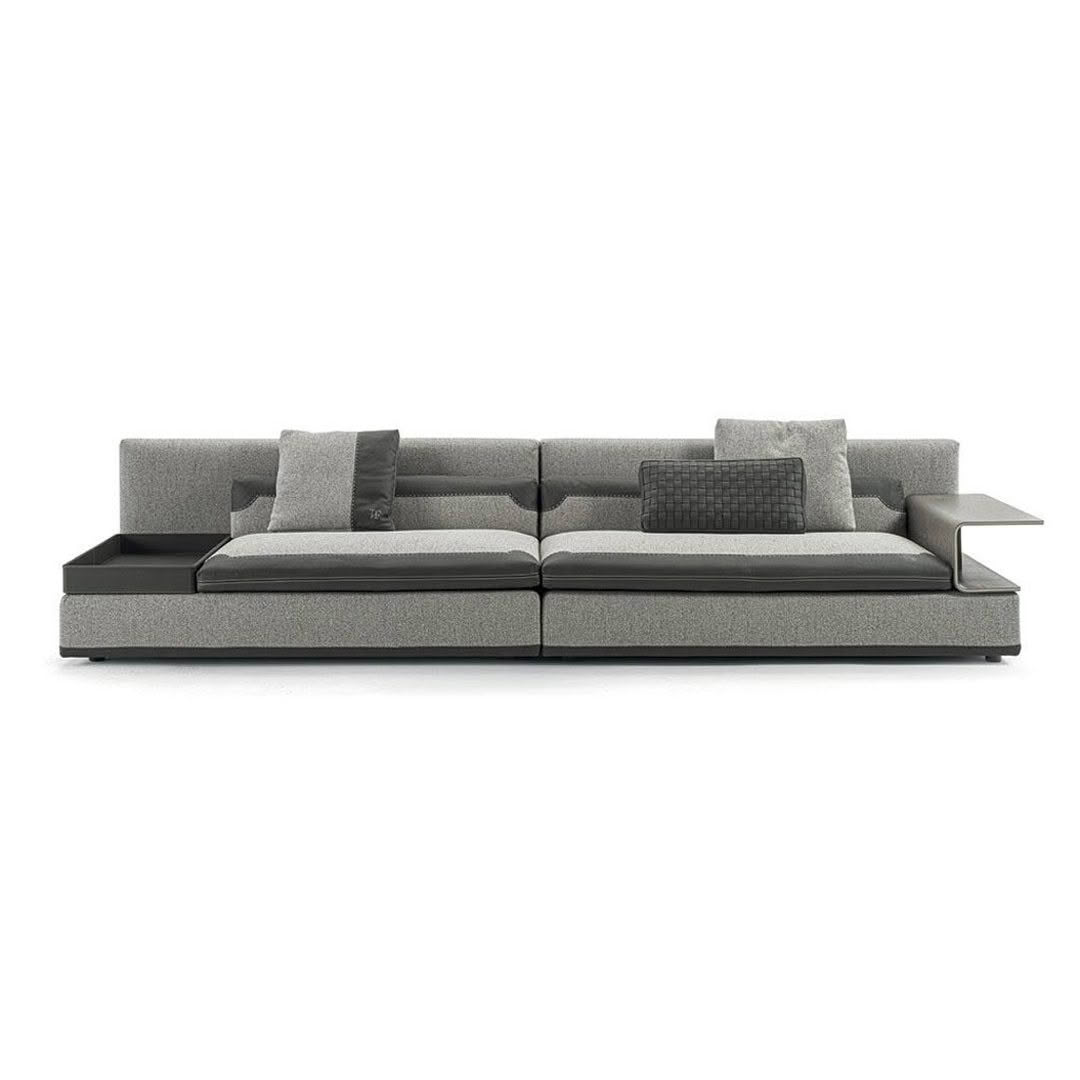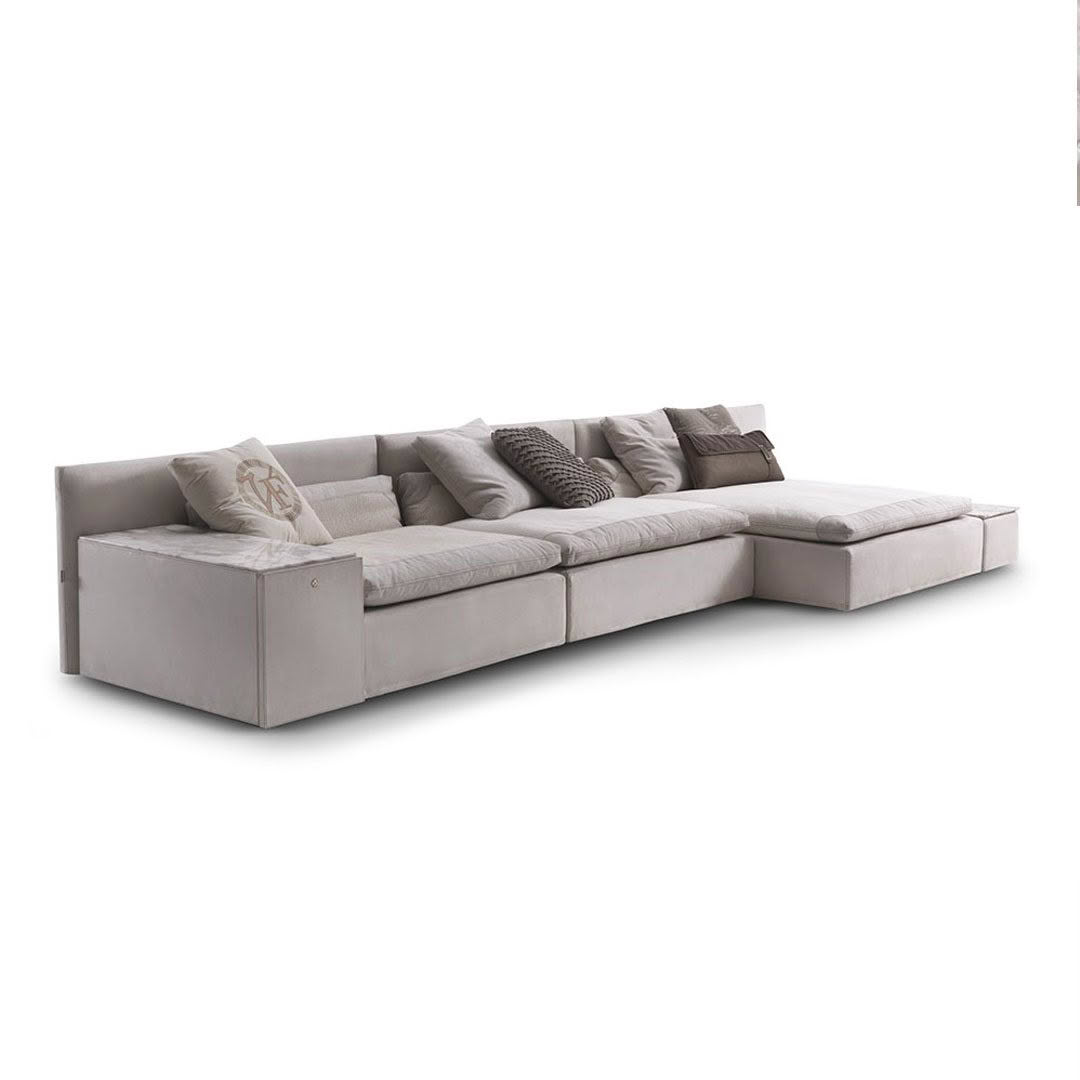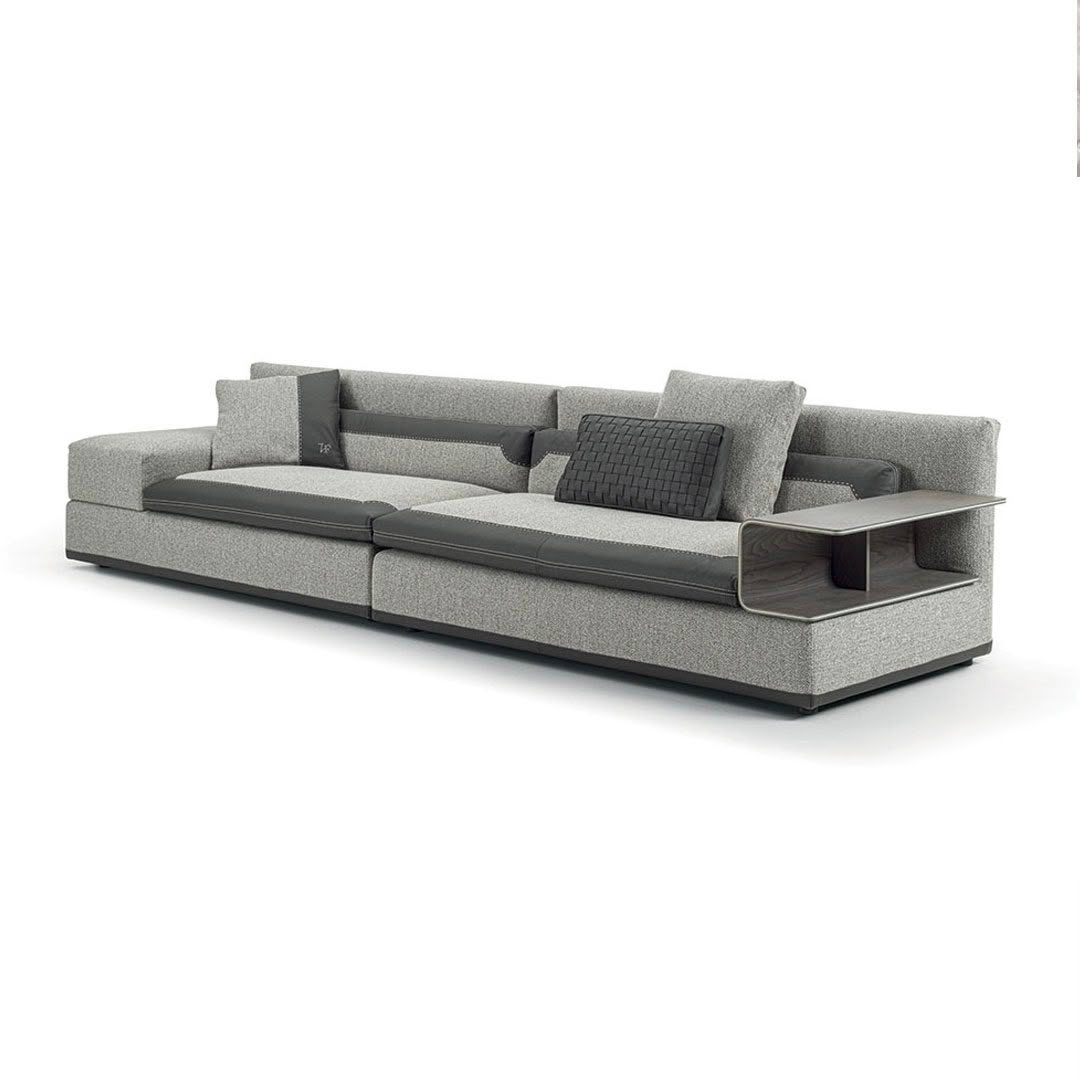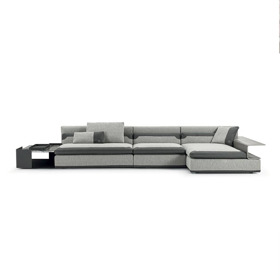 Spinola modular sofa, from Vittoria Frigerio luxury collection, seeks in its simple, clean lines a rigorous formal perfection that matches the soft seat and back cushions, for a sophisticated contrast of textures and details. The geometric structure is enhanced by the seat cushions that continue into small integrated back cushions, finished with leather inserts and contrasting stitching. Spinola sofa offers endless modularity for unexpected design solutions, including double-sided elements and integrated accessories, such as leather-covered small tables with marble tops, different armrests, and wooden volumes.