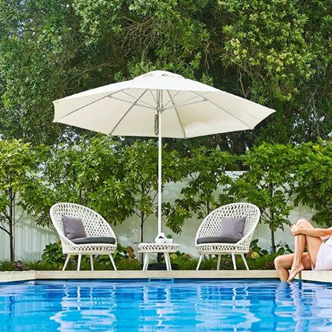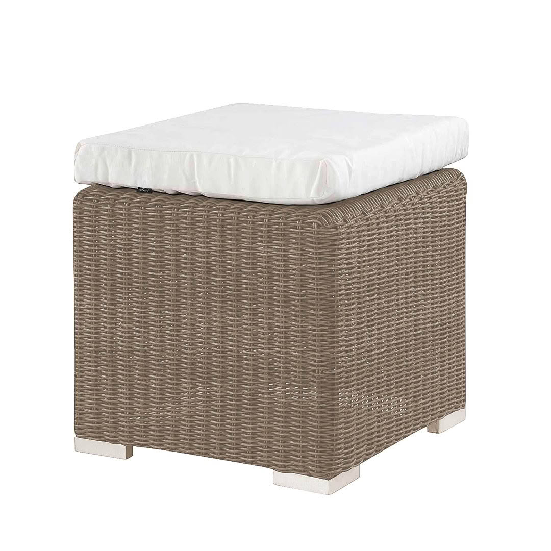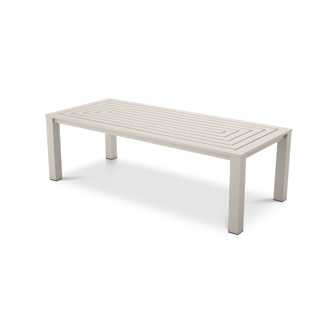 Beige square coffee table with geometric designOutdoor poolside furniture with white cushions and table