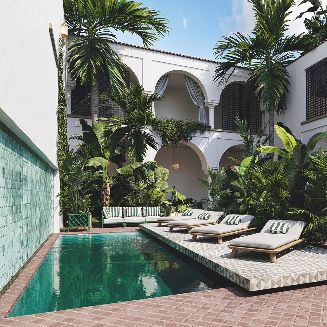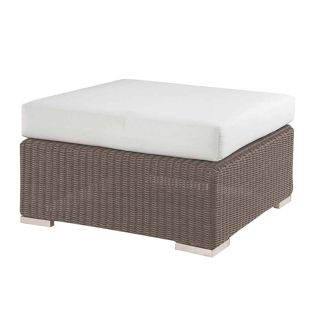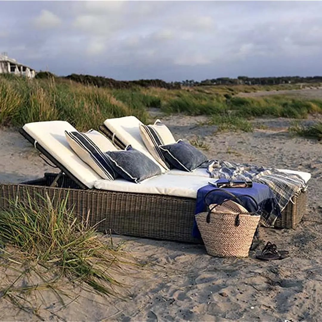 Beige square coffee table with geometric designOutdoor poolside furniture with white cushions and table