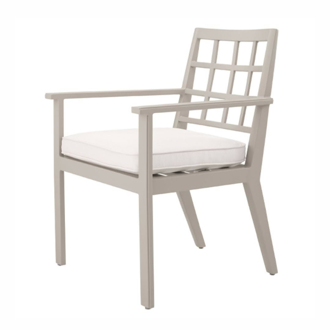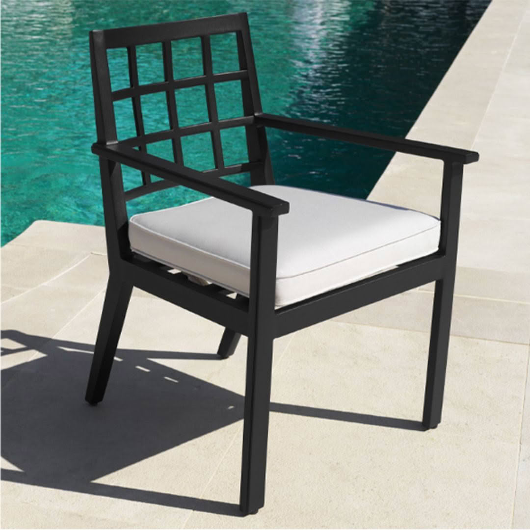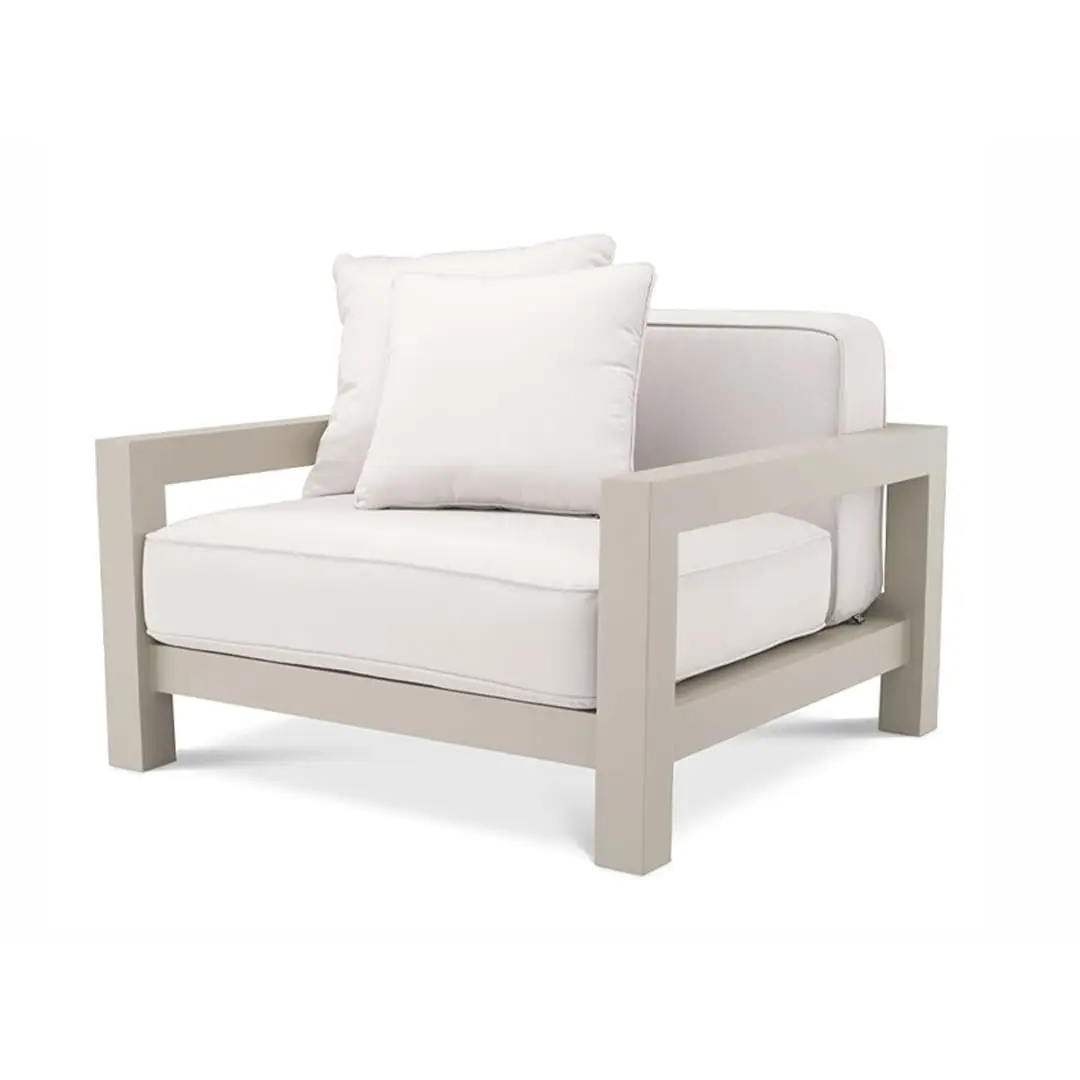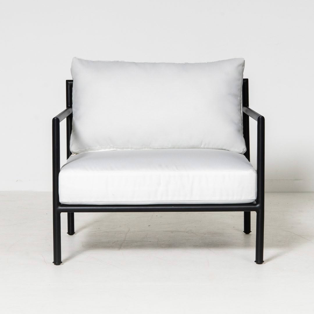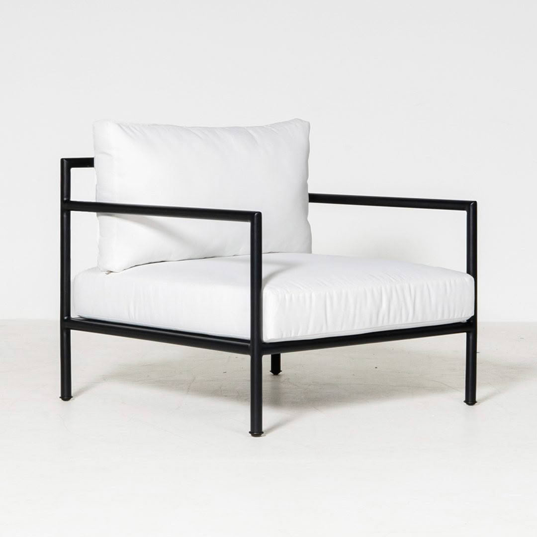 Modern gray armchair with white cushionsModern white cushioned outdoor chair with grey frame