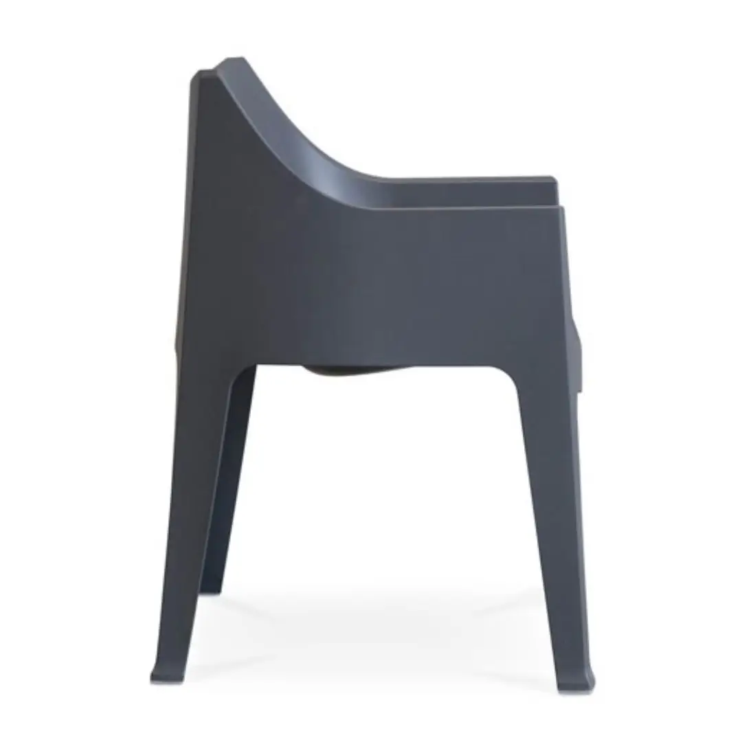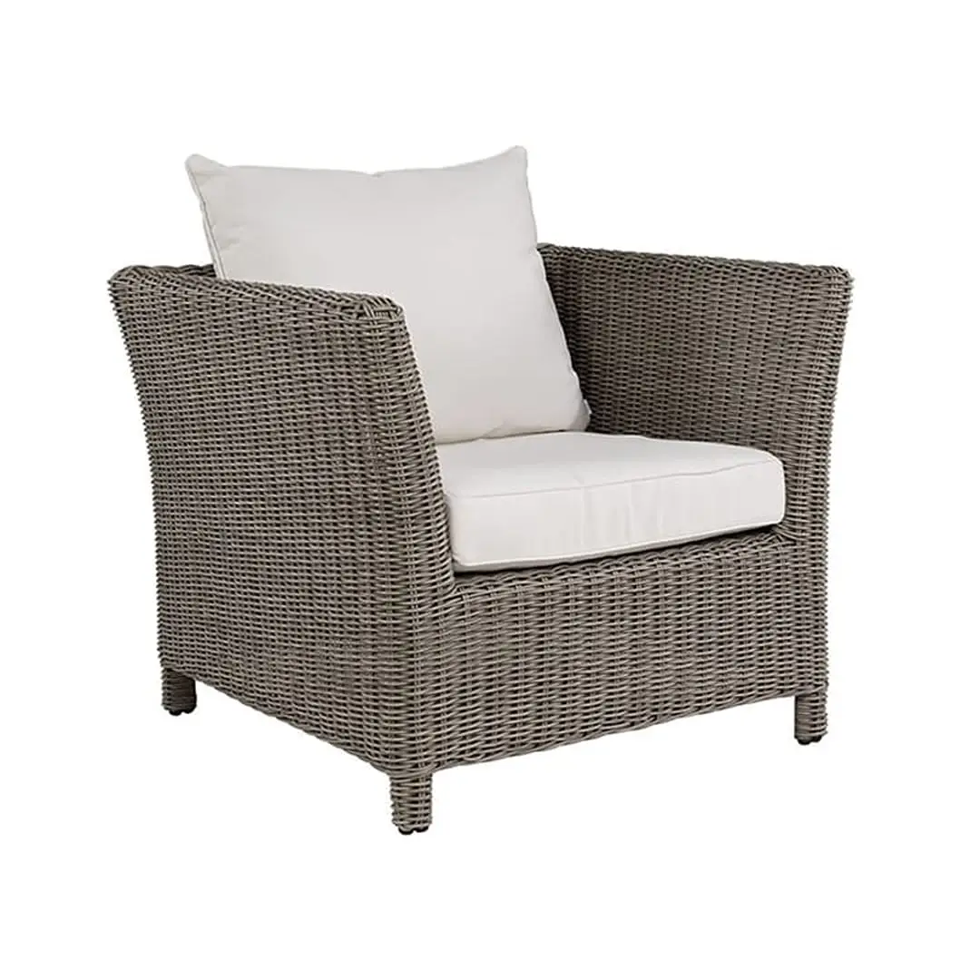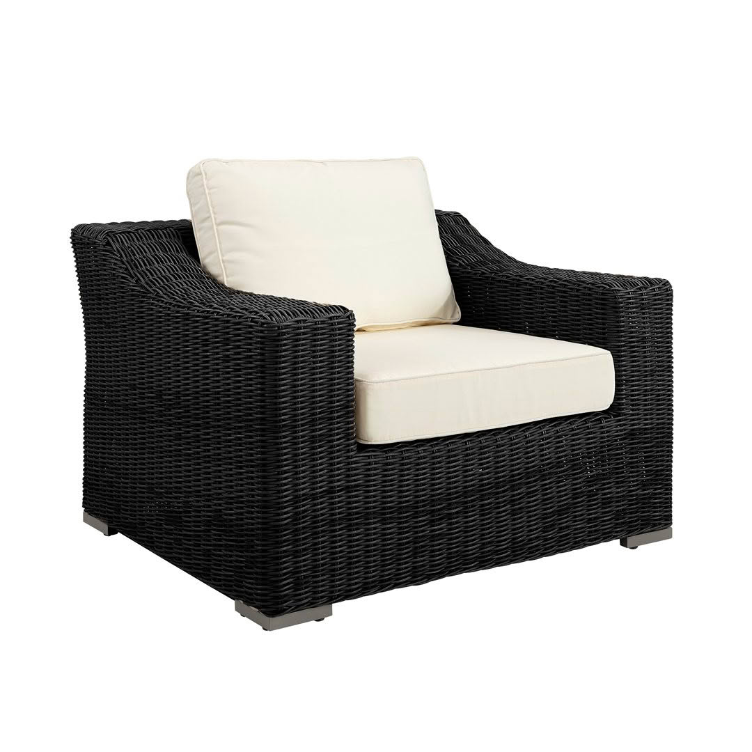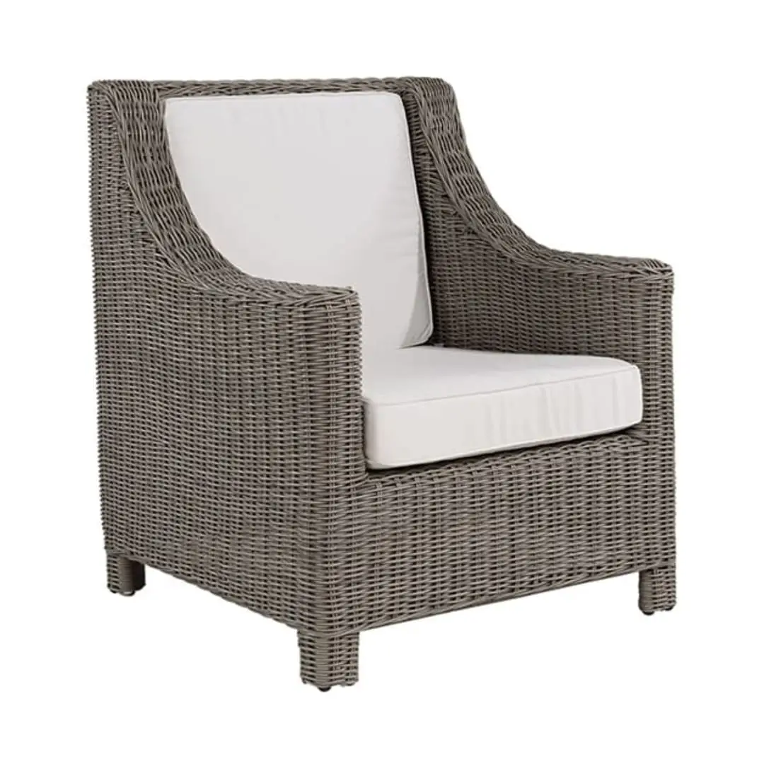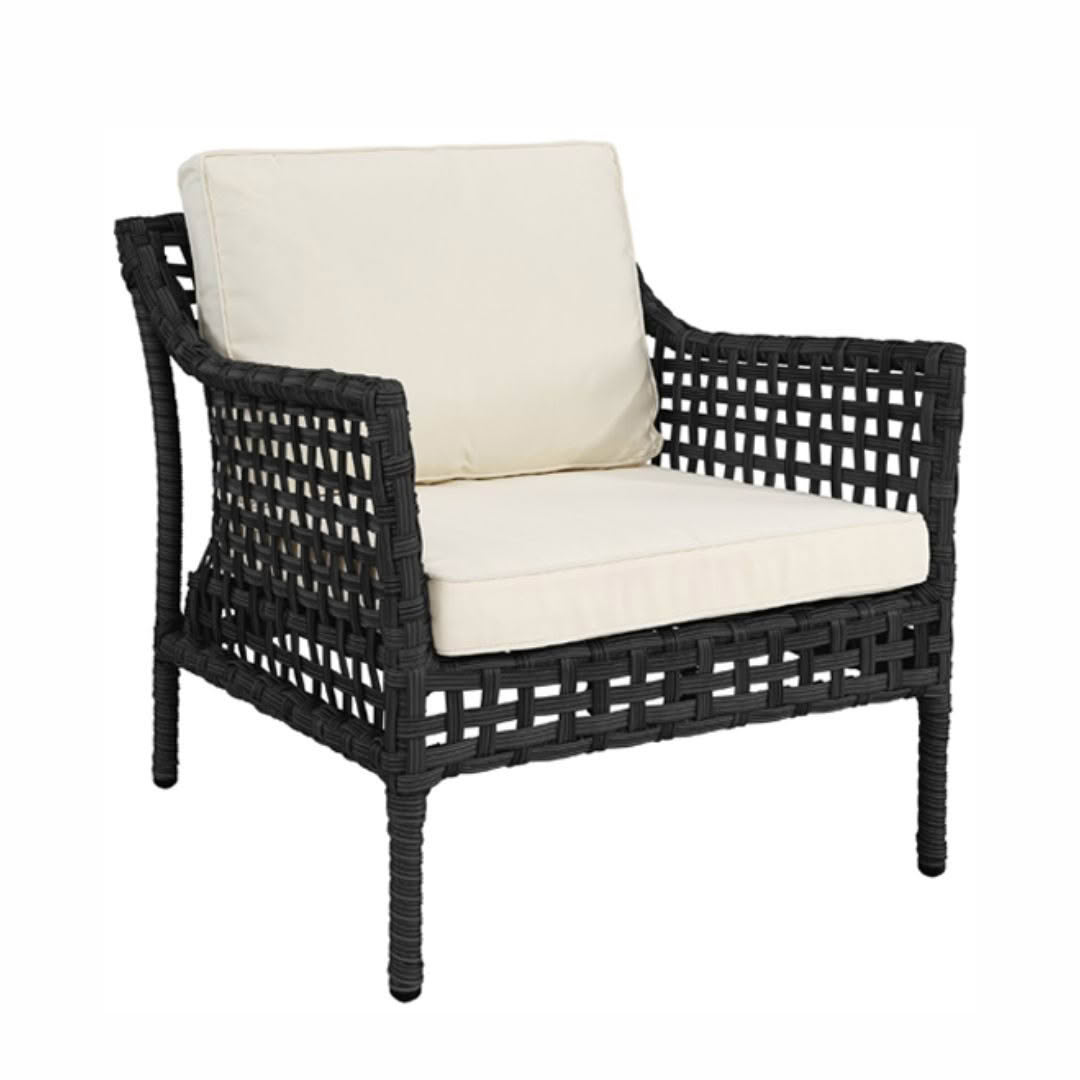 Modern gray armchair with white cushionsModern white cushioned outdoor chair with grey frame