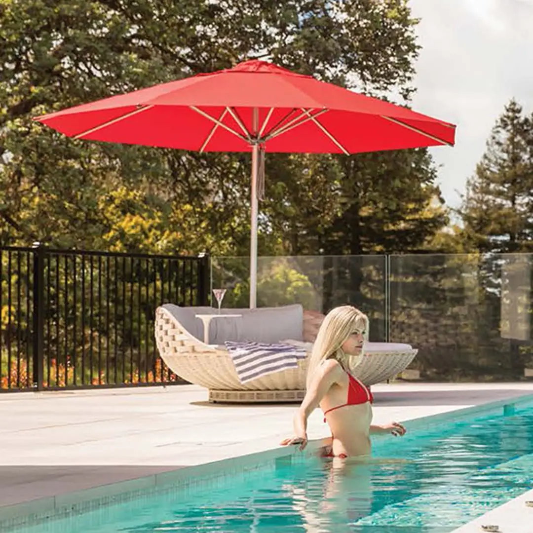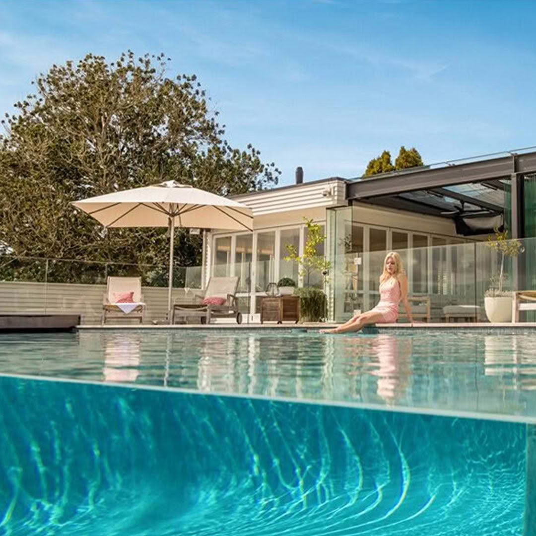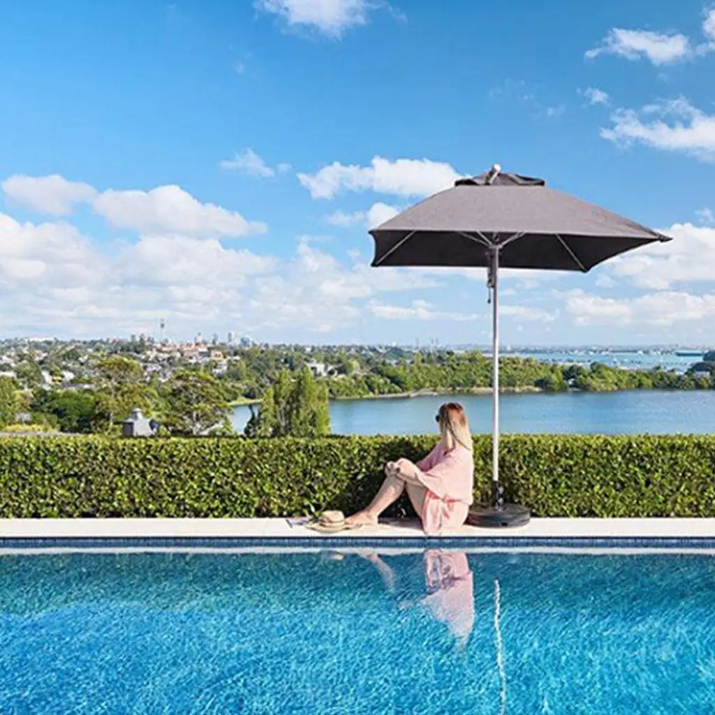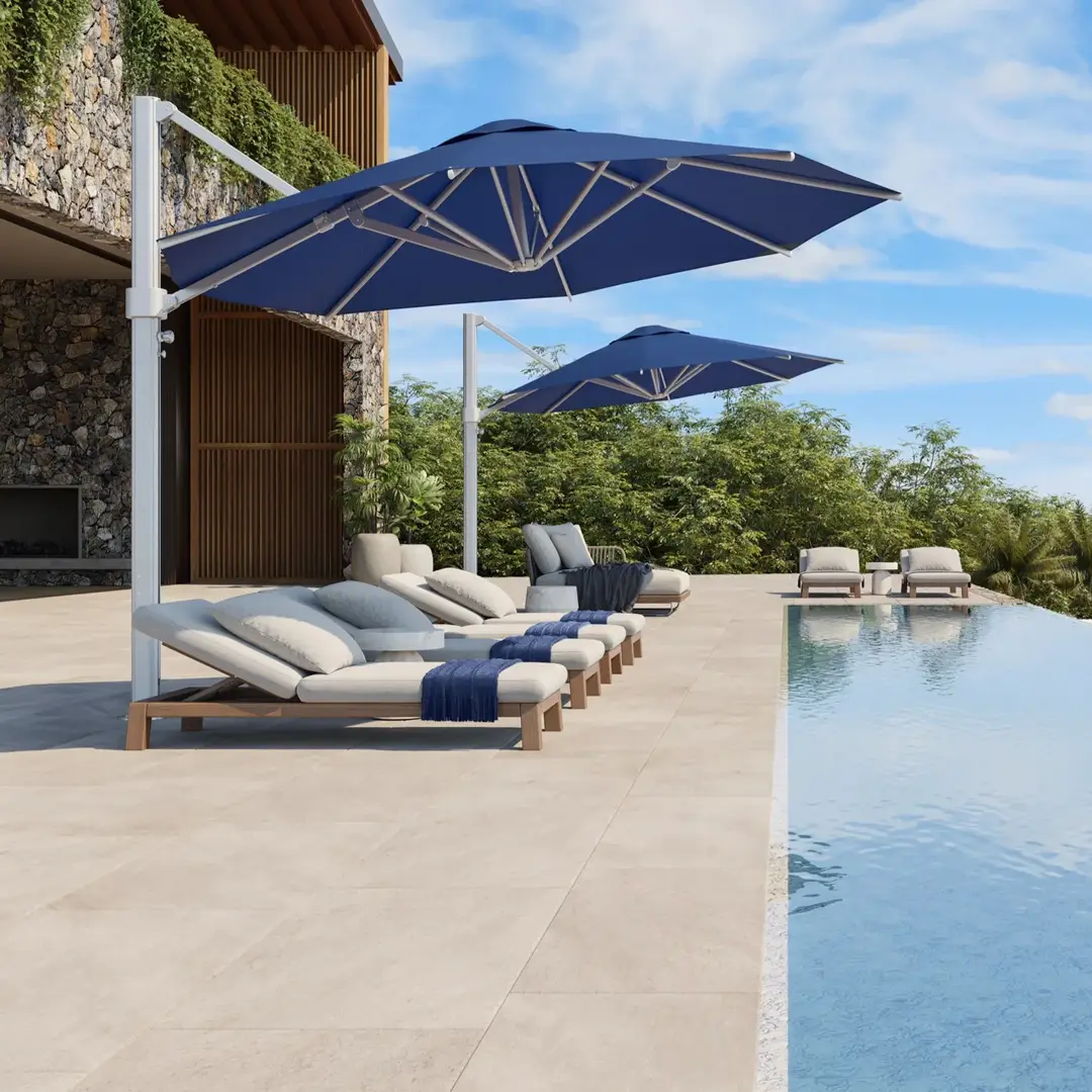 Luxury outdoor poolside lounge area with mountains view