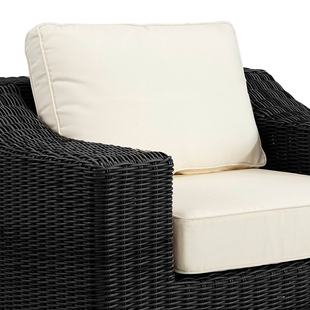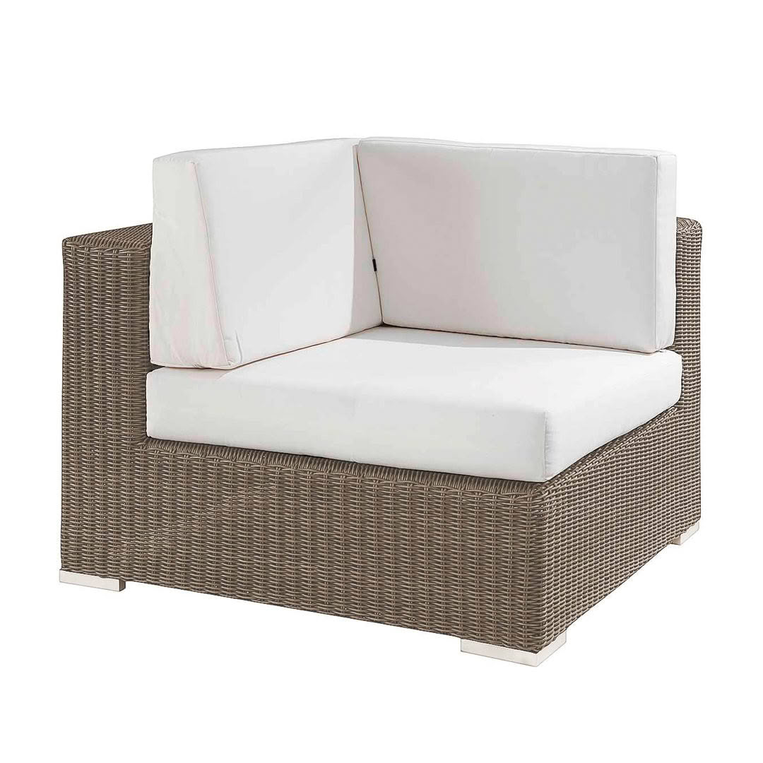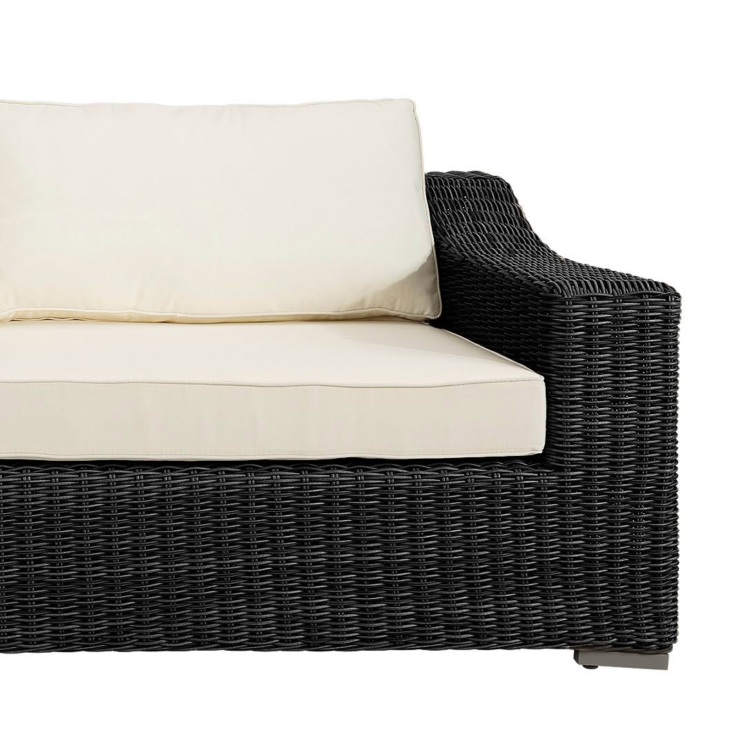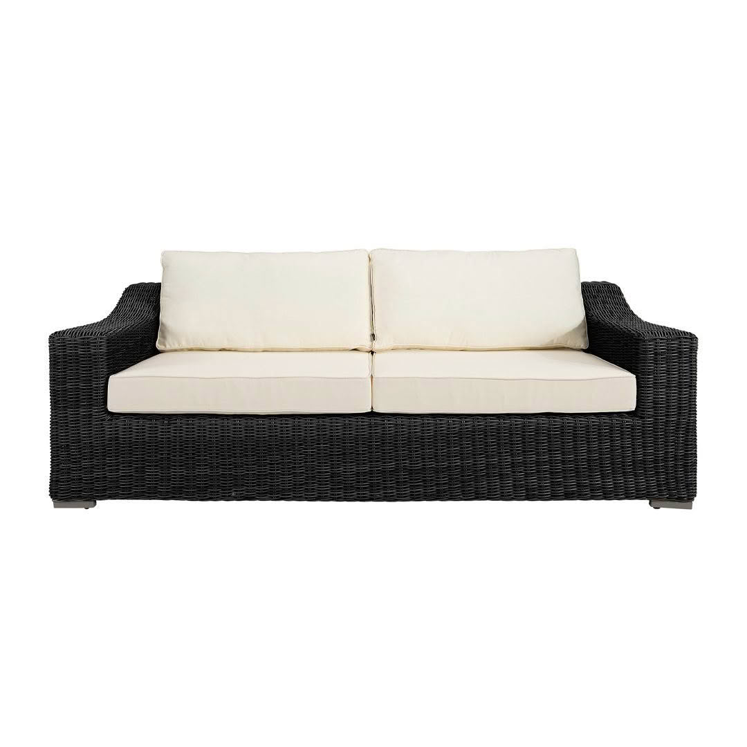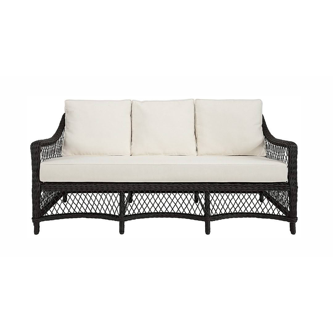 Wicker outdoor sofa with white cushions