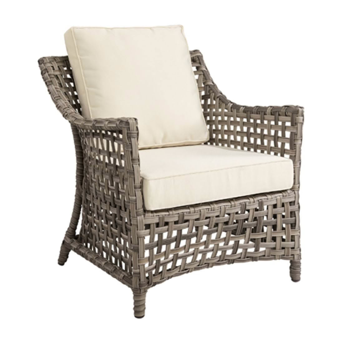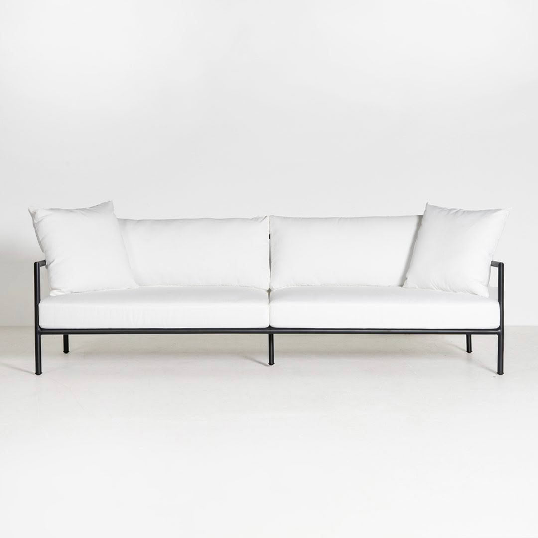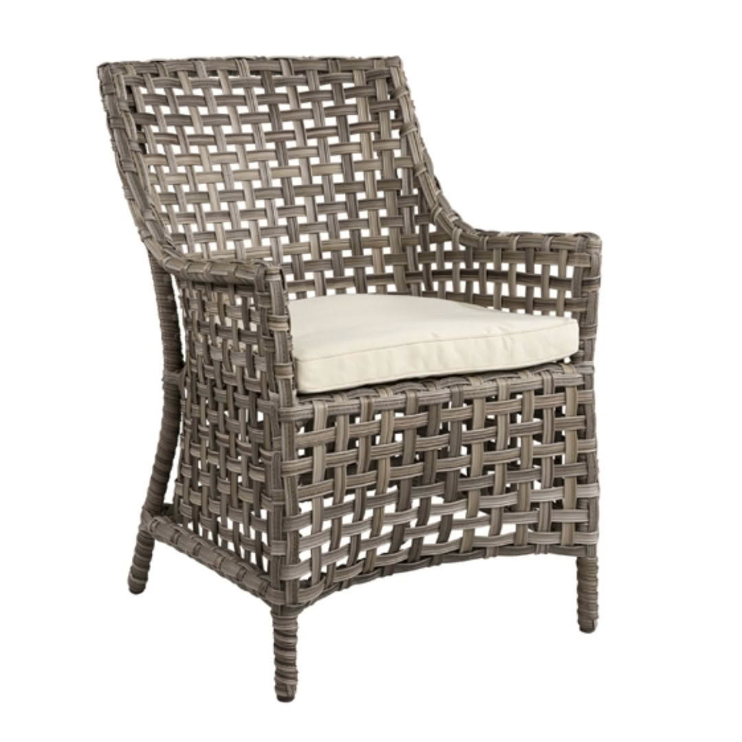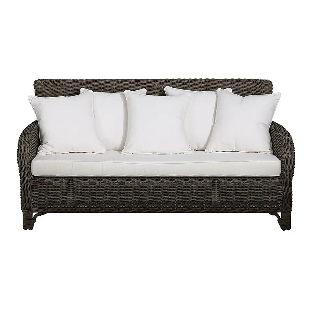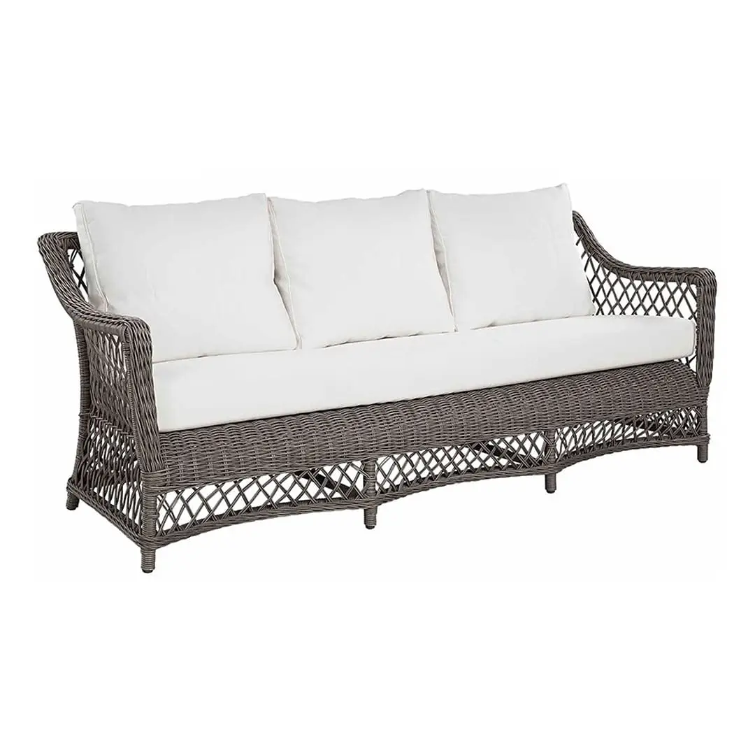 Gray wicker sofa with white cushions