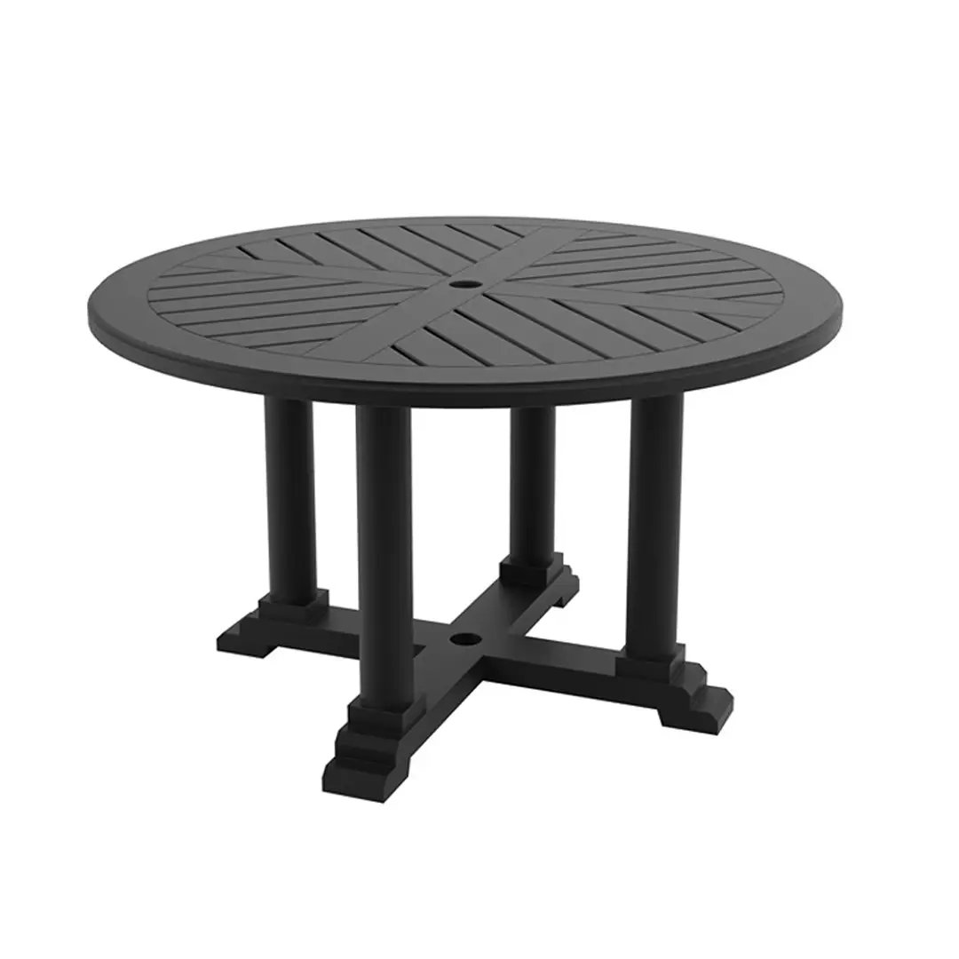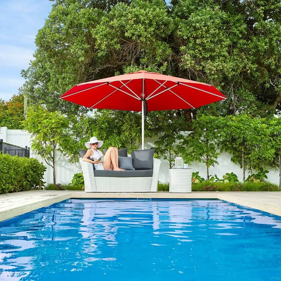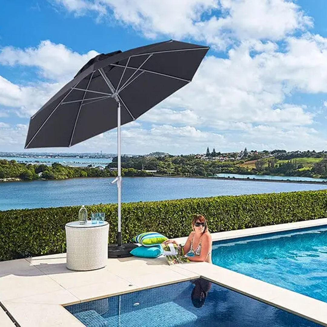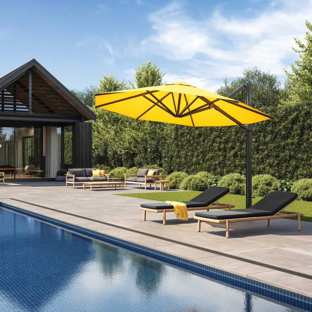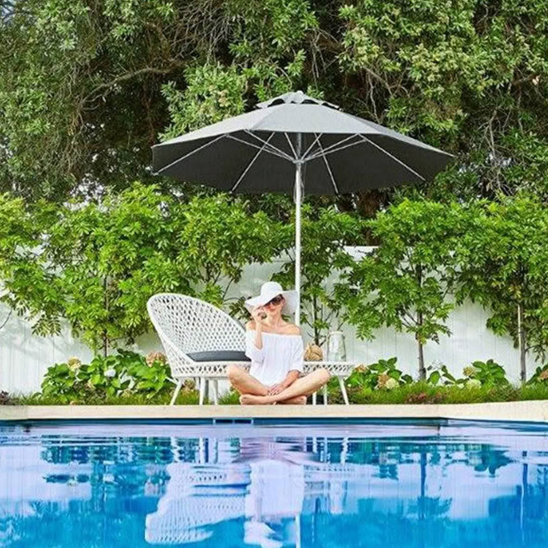 Outdoor dining set by pool with scenic background