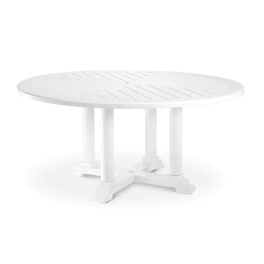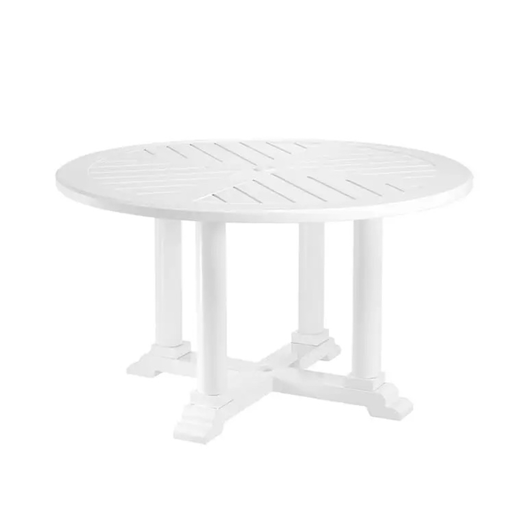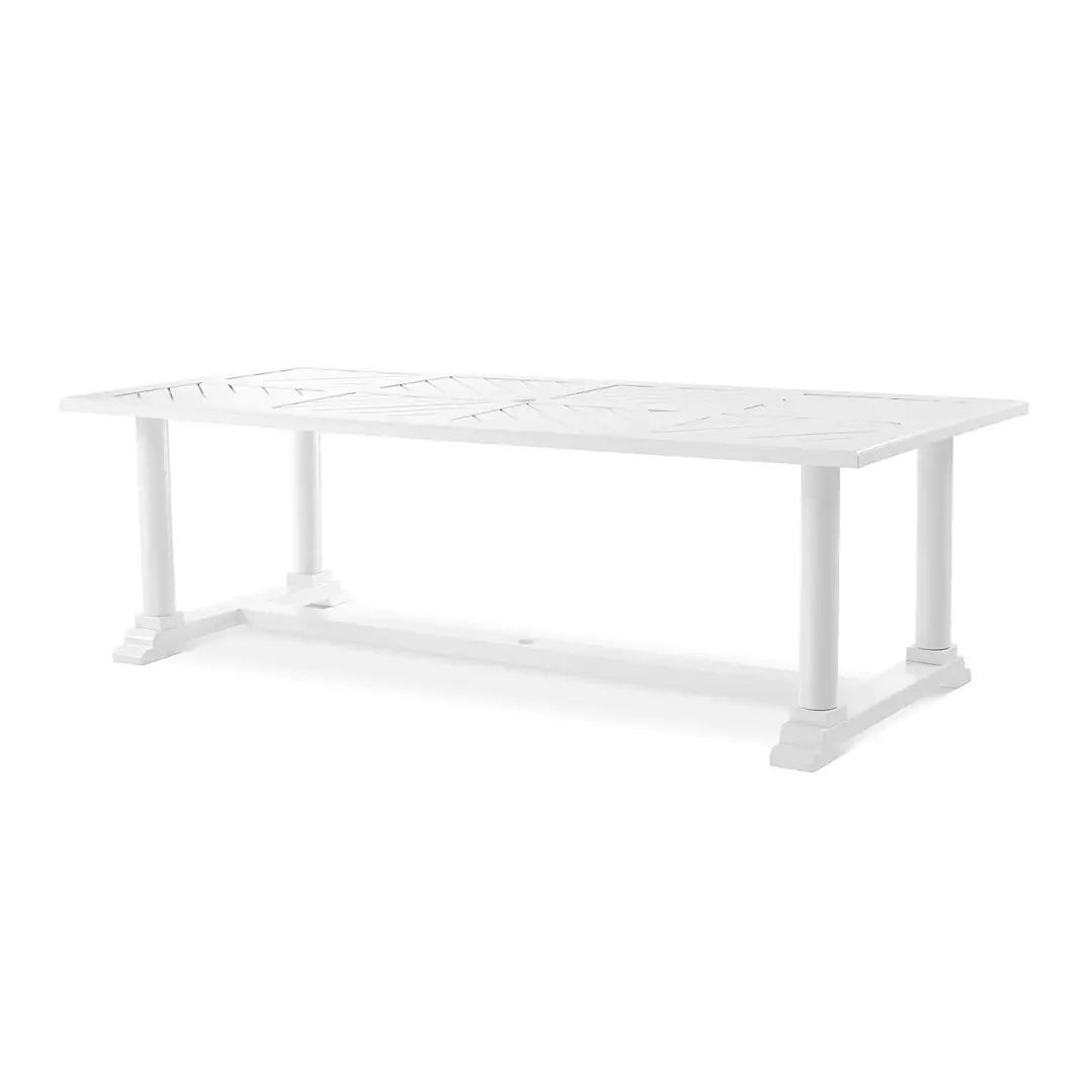 White outdoor dining table with chairs and glassware